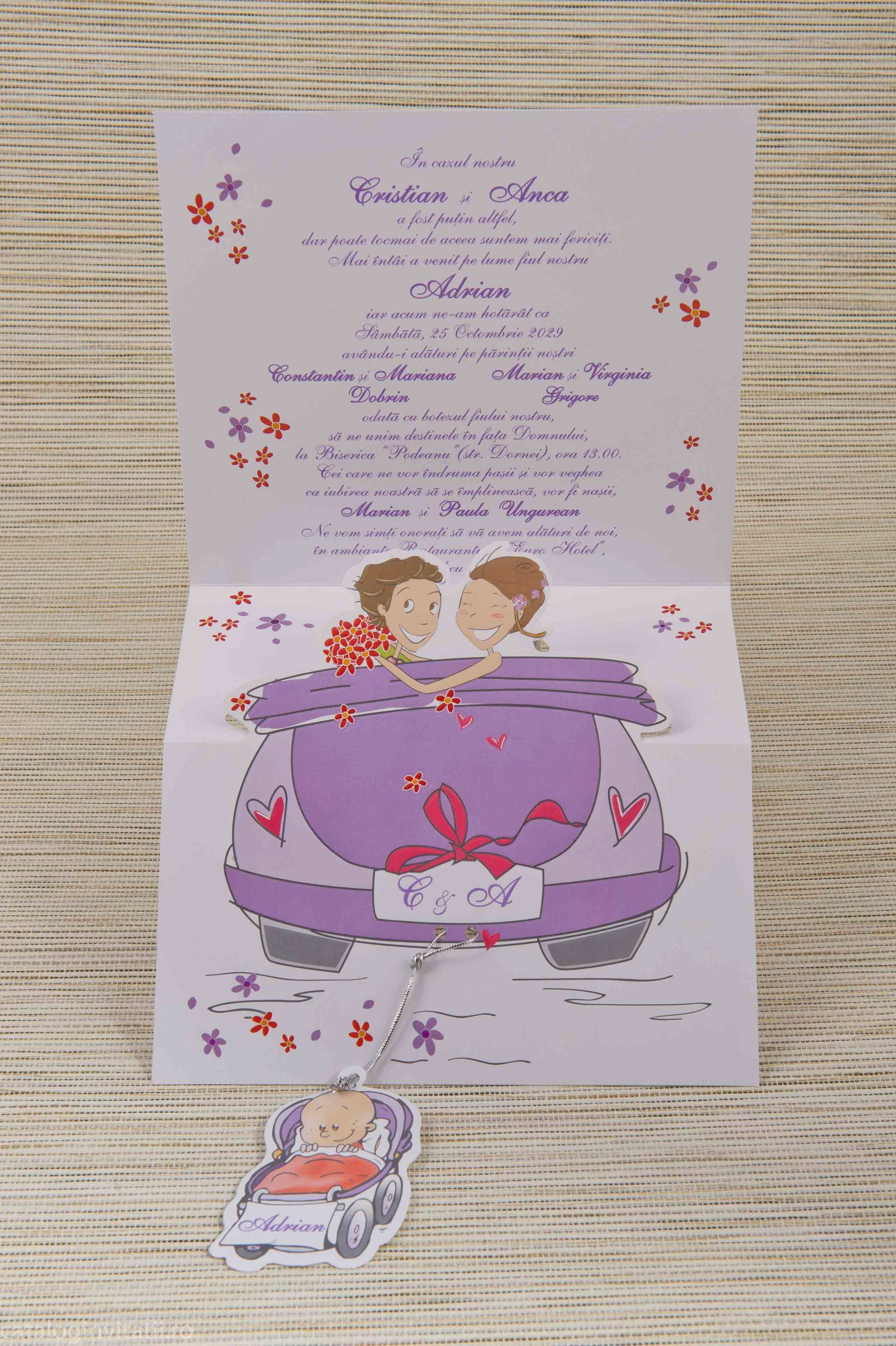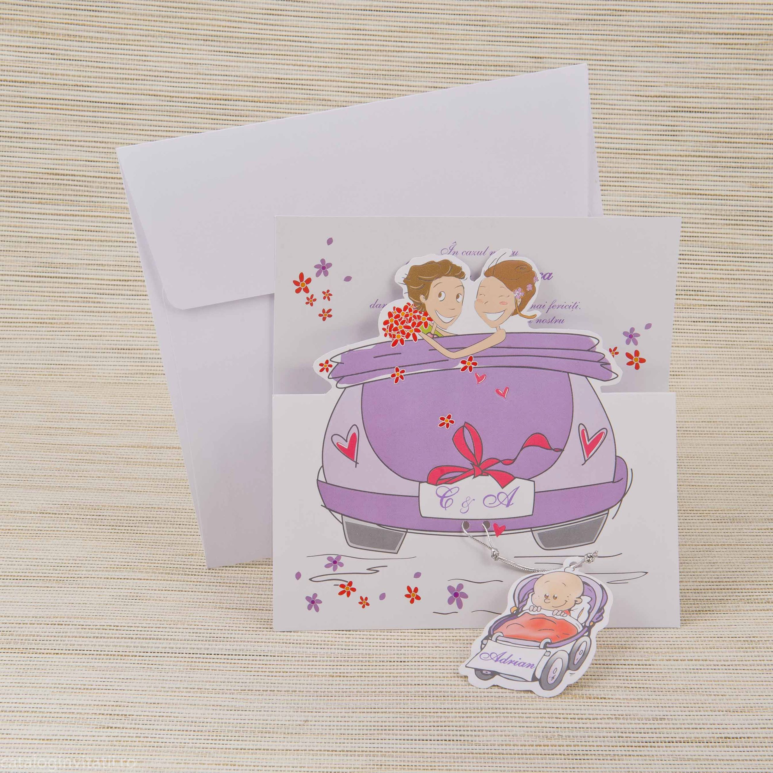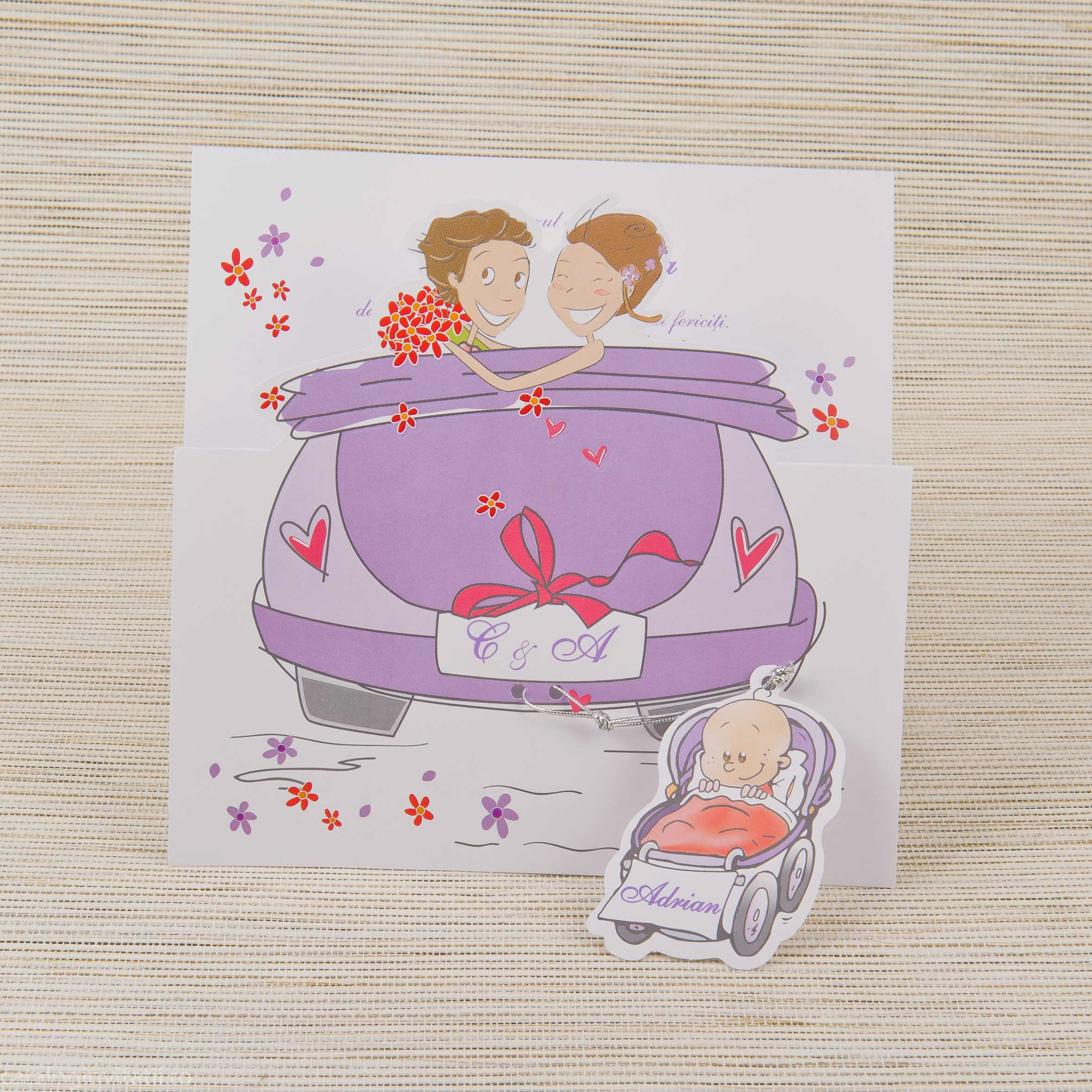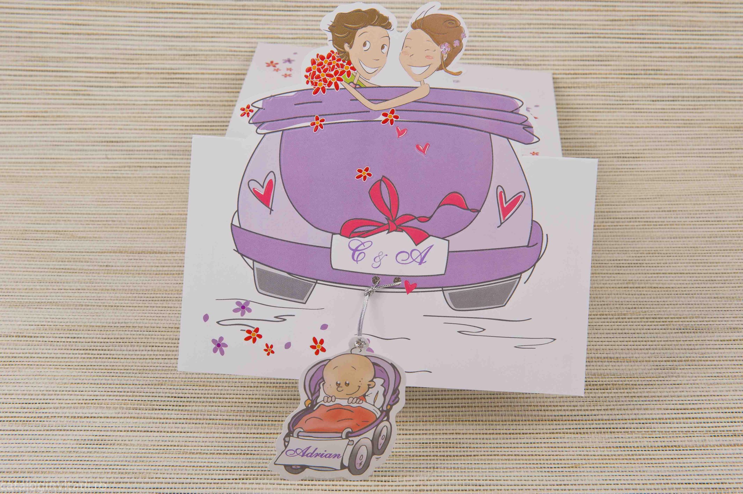 Invitațiile noastre de Nuntă cu Mireasă, Mire și Bebeluș sunt special create pentru a celebra această zi minunată și cea mai romantică călătorie: Luna de Miere! Fiecare invitație este fabricată cu mare atenție și include detalii adorabile precum: ilustrații cuplu, bebeluș și detalii despre călătorie. Aceste invitații haioase sunt minunate pentru a celebra această zi unică și vor aduce un zâmbet pe buzele tuturor invitaților tăi!”