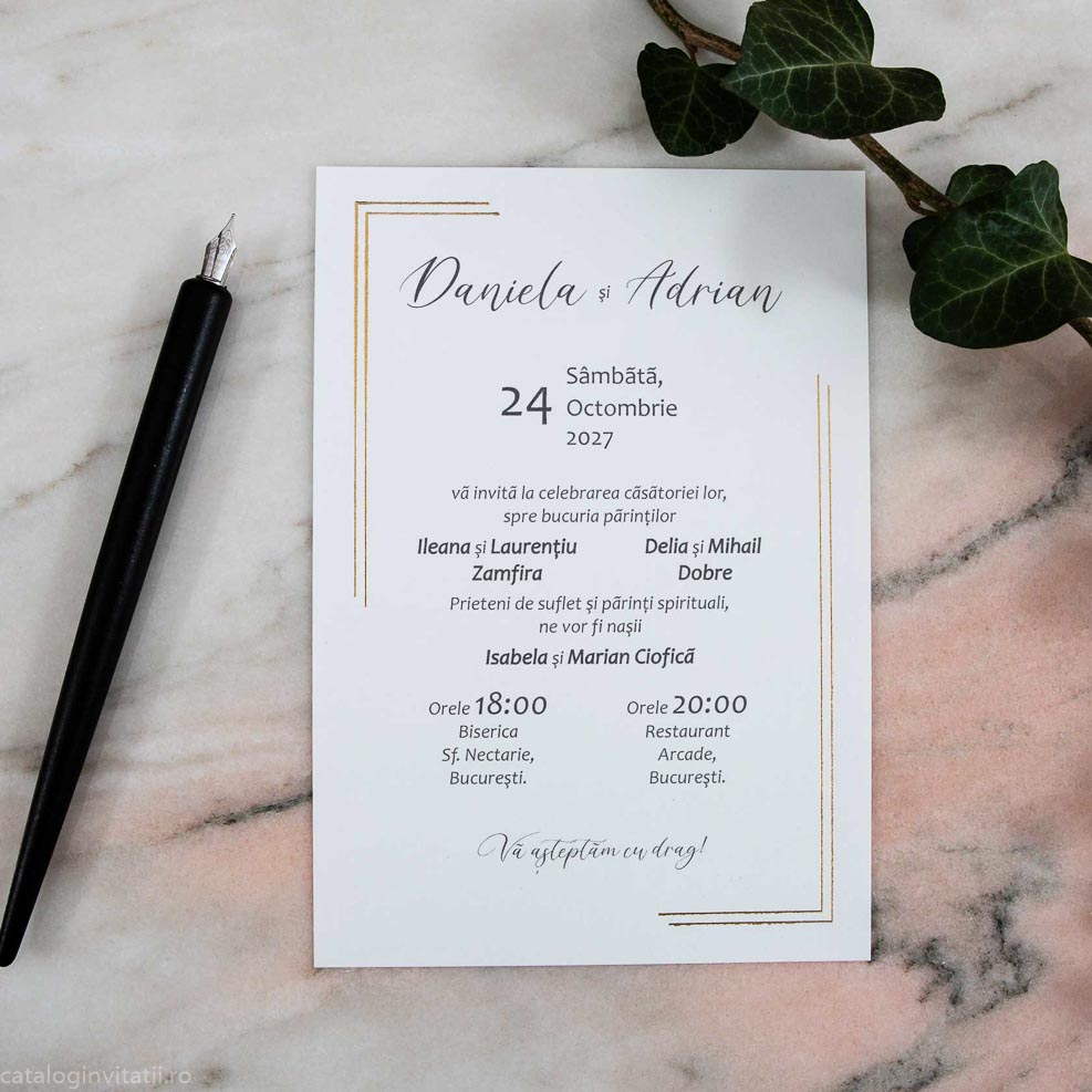 Cu un text impecabil și rafinat, invitația redă cu precizie informațiile relevante, punând în valoare importanța momentului pe care îl sărbătoriți. Fiecare detaliu este proiectat cu grijă și atenție pentru a asigura o prezentare estetică și clară.