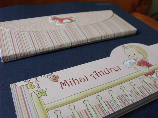 invitație realizată din carton care se împătureste in trei parti egale pe orizontala.  La interior invitaia este decorata cu elemente grafice ce reprezinta dormitorul unui copil plin cu jucarii, ursulet, calut de lemn, ursulet, cuburi cu litere, masinuta, broasca testoasa, zebra. Cei doi ursuleti din imagine folosesc pensula pentru pictura pentru a scrie textul ce este dispus perpendicular pe peretele dormitorului si pe covor. Cand invitatia este impaturita ramane vizibil doar bebelusul ce sta in patuţ si tine biberonul cu lapte in gura. Plicul este dreptunghiular cu dungi verticale multicolore si un căluț ca sigiliu.