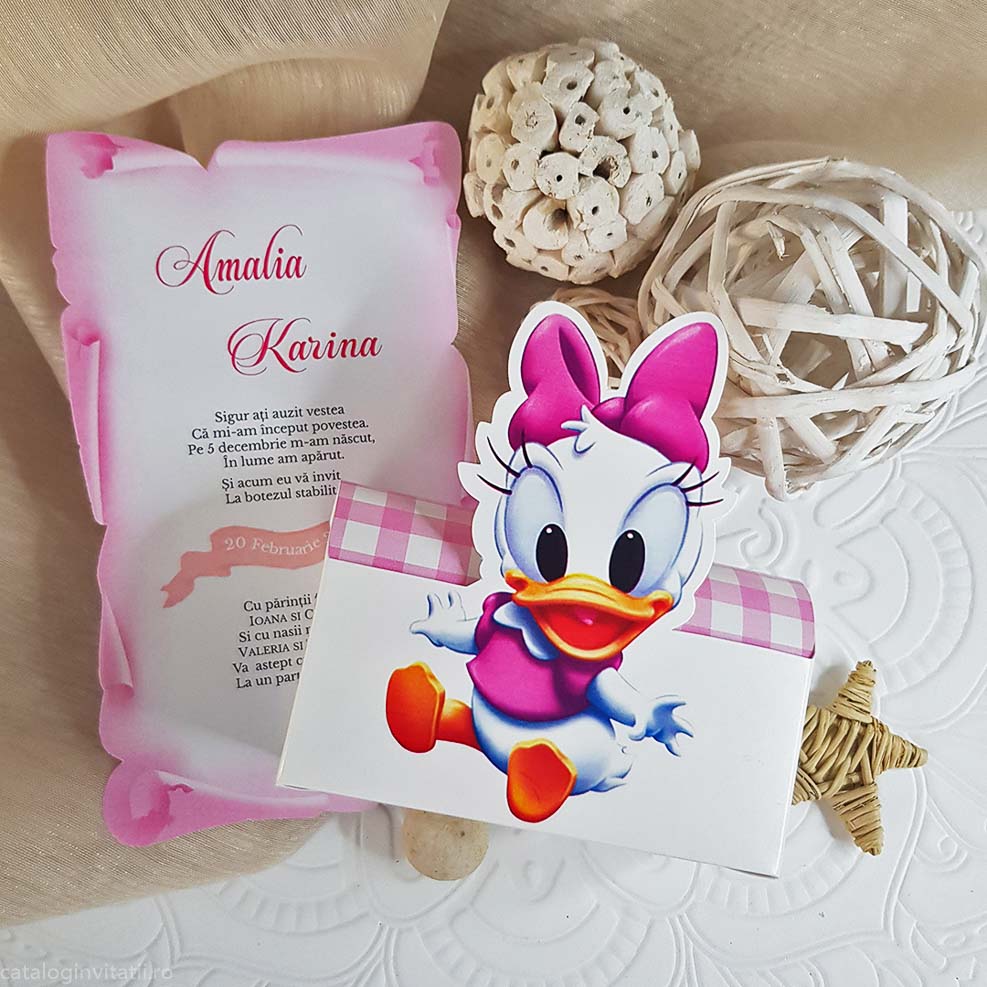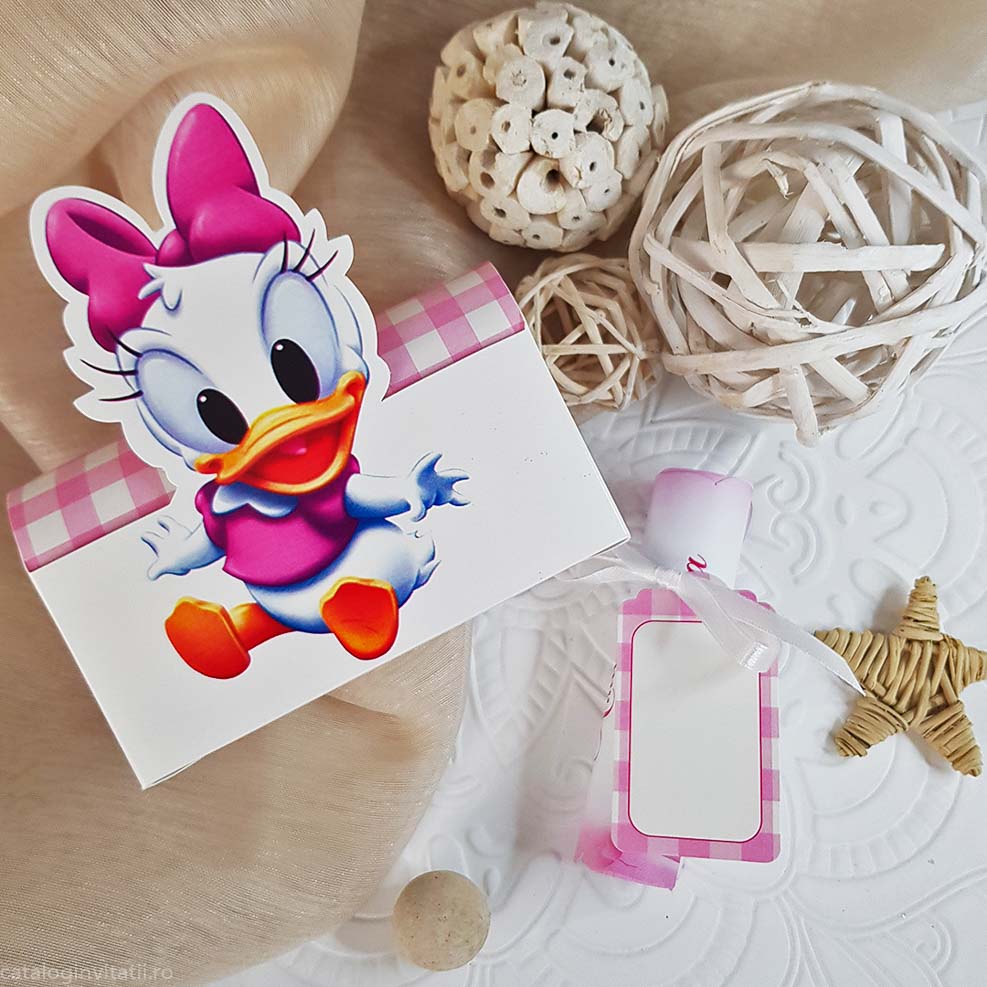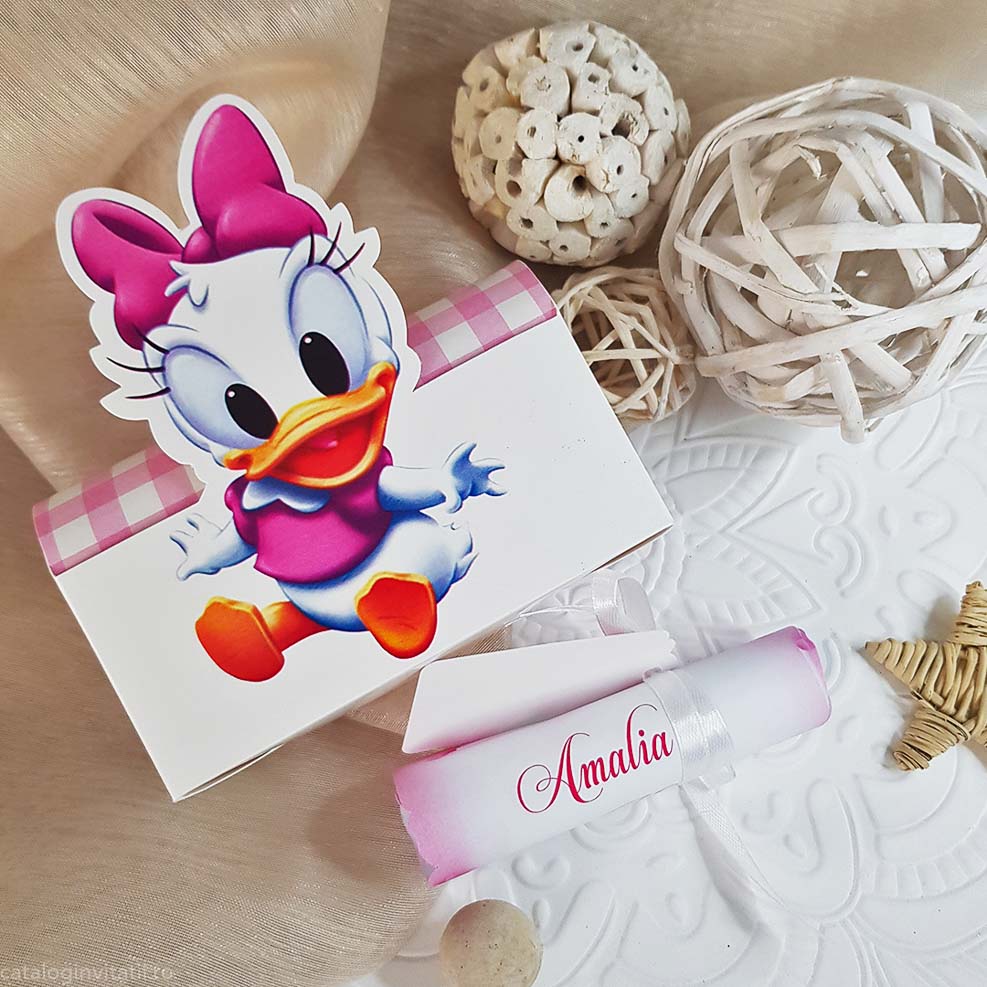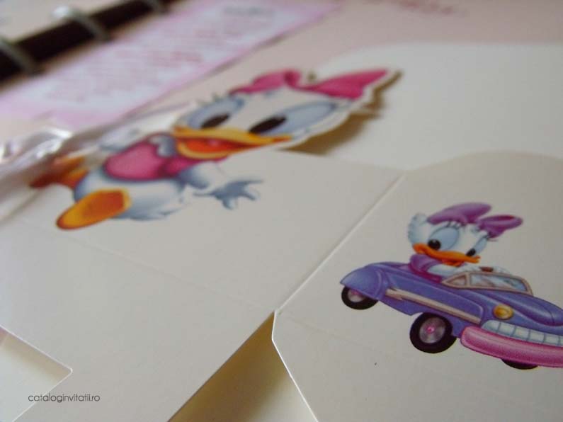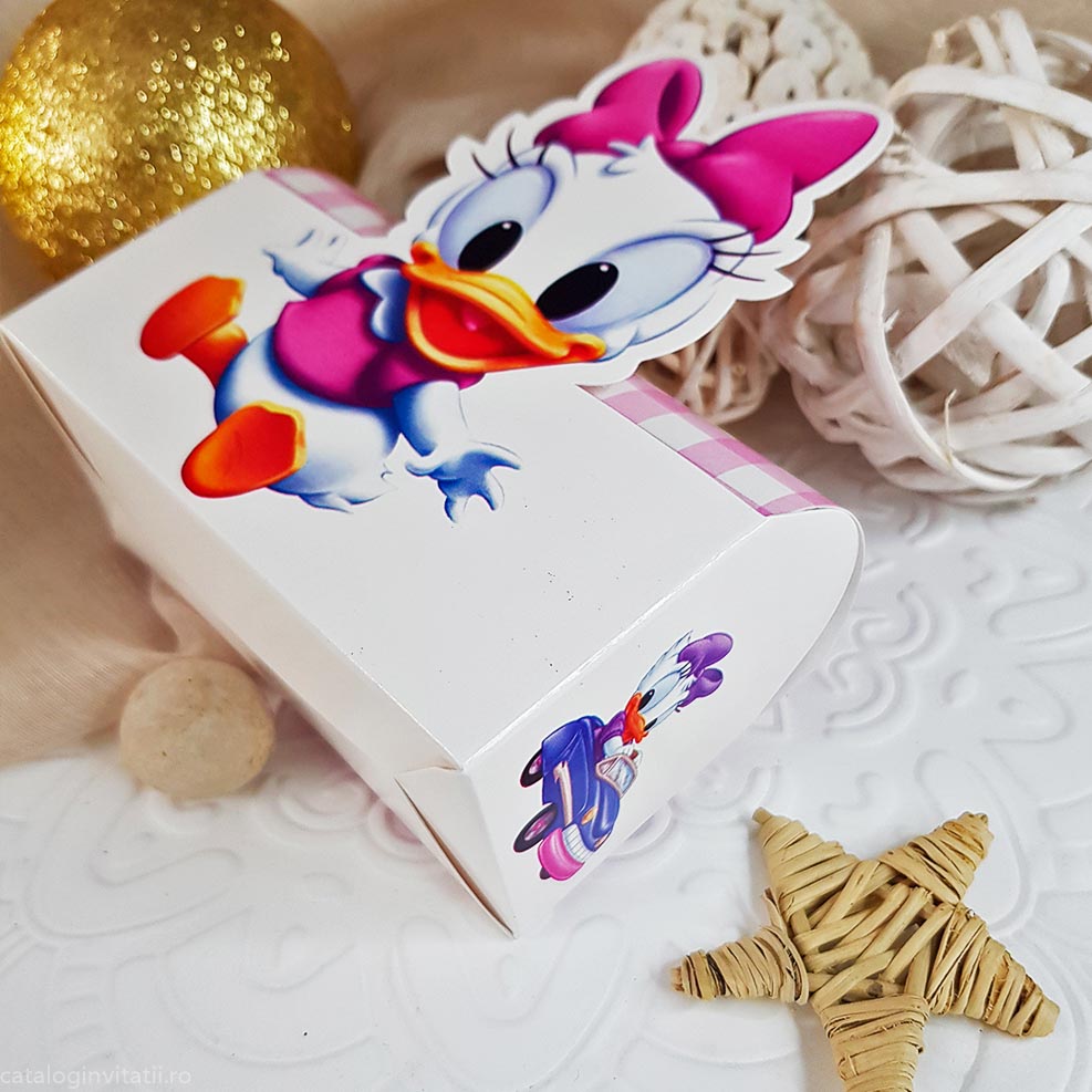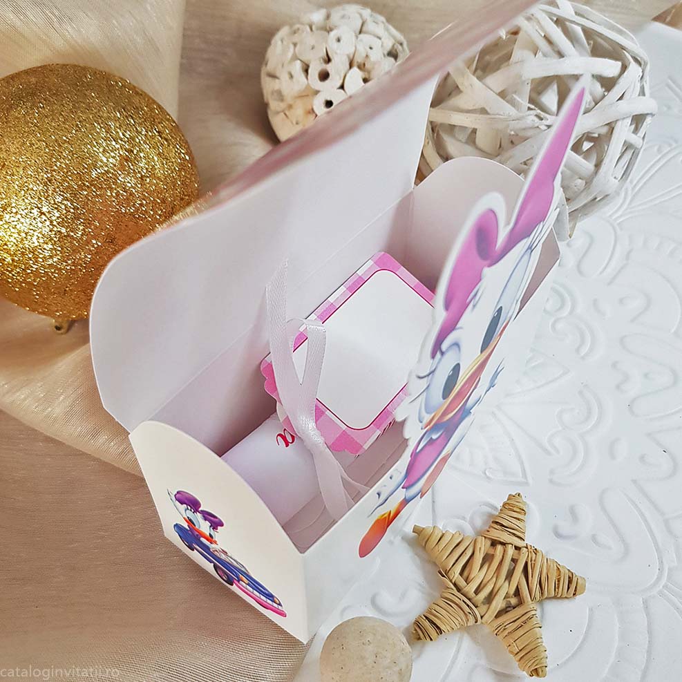 Este realizat din doua parti : un cufar din carton alb decorat cu elemente grafice in carouri roz si ratusca Daisy care are capul decupat pentru o senzatie 3D. Pe laterale rățușca apare la volanul unei mașinuțe.