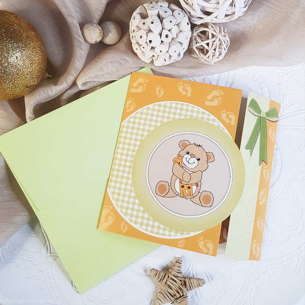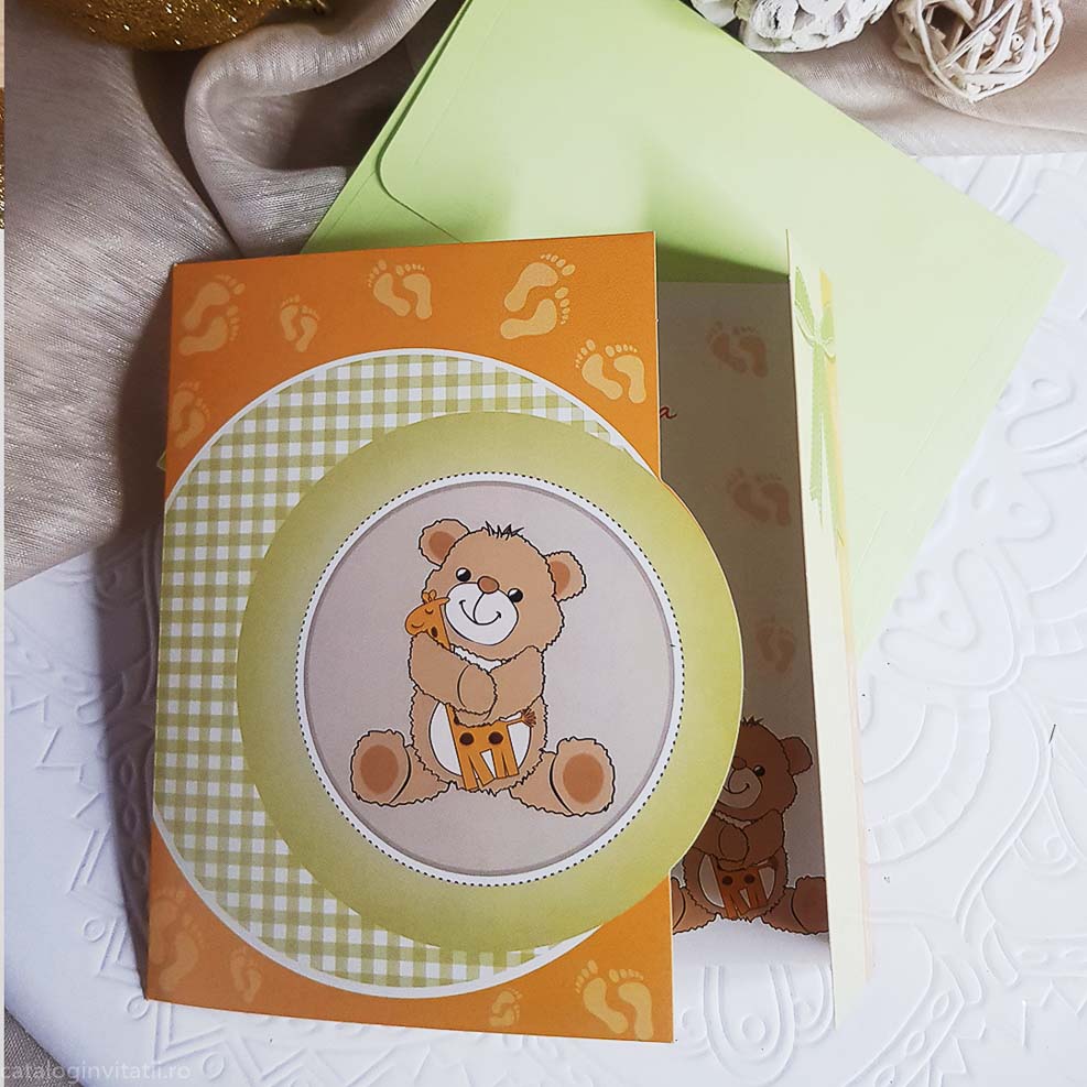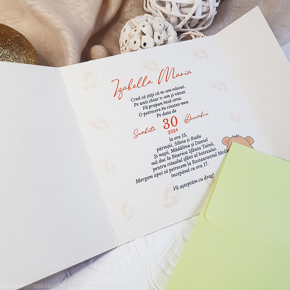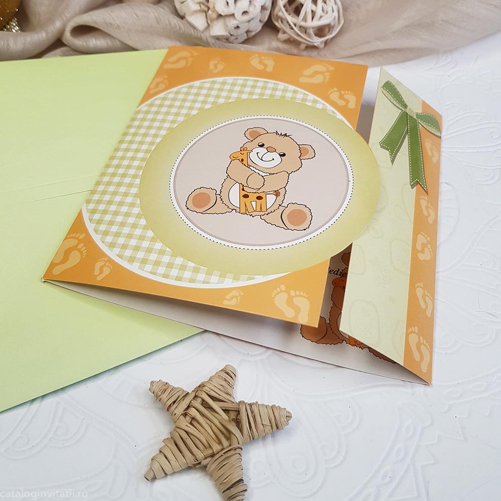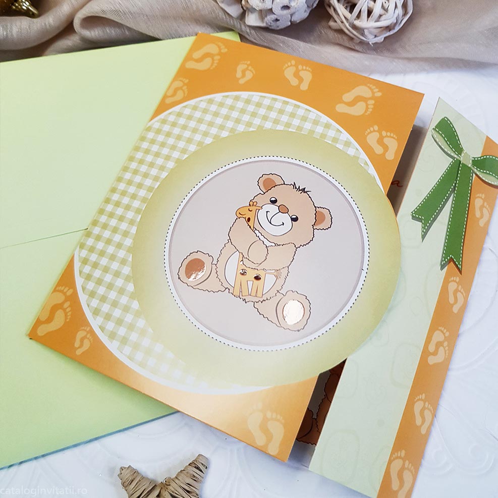 Invitatie botez portocalie funda verde si ursulet 117 este un model realizat dintr-un carton impaturit in trei pe verticala ce combina culoarile verzui, portocaliu, maron. La interior se tipareste textul pe un fundal alb cu patern picioruse copii si un ursulet ce tine o jucarie in brate.