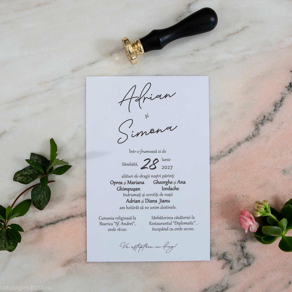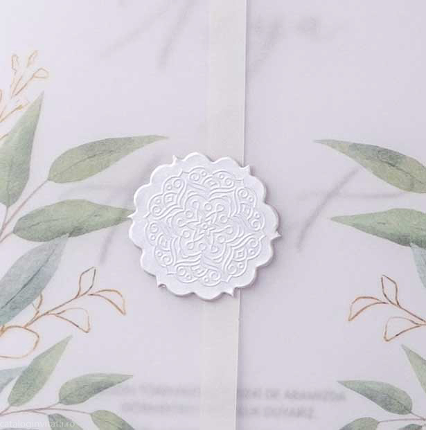 Cartonul de 250 g/mp este alegerea perfectă pentru cei care caută rezistență și durabilitate. Tehnica de imprimare precisă conferă textului o claritate uimitoare, captând privirile și încântând simțurile. Decorul vegetal, cu ramuri verzi și aurii, adaugă prospețime și eleganță, completând designul cu un aer sofisticat.