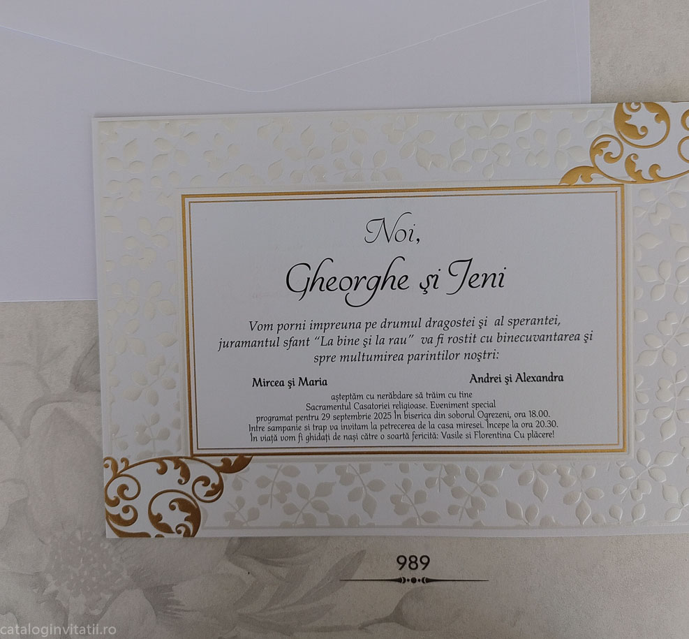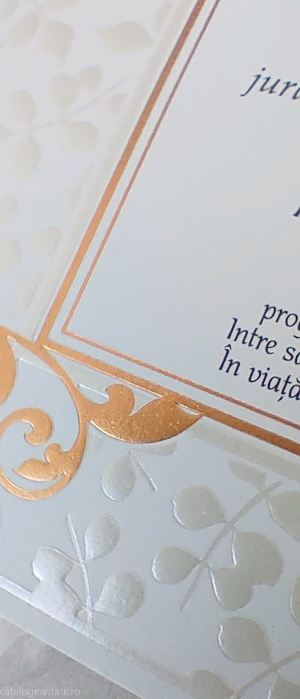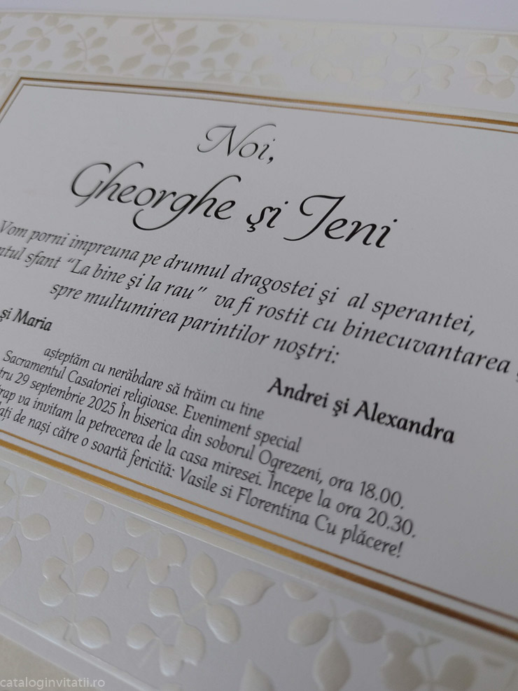 Invitație chenar auriu ramuri embosate 989  este un model realizat dintr-un carton decorat cu model grafic embosat din ramuri cu frunze, un chenar auriu încadrează textul iar în colțuri este decorat cu elemente aurii folio cu reflexii metalice aurii.
