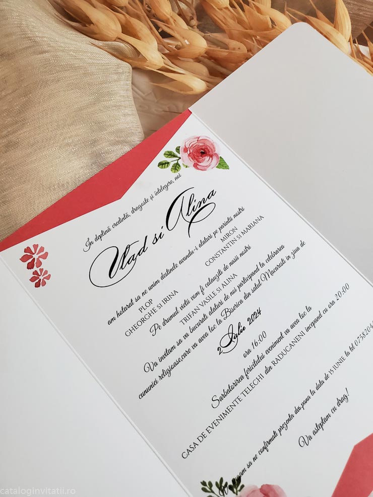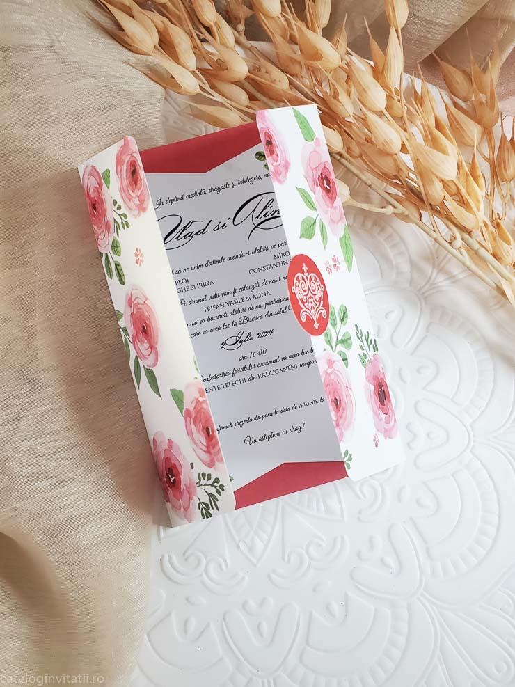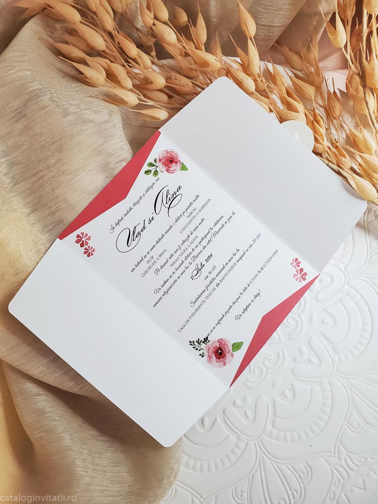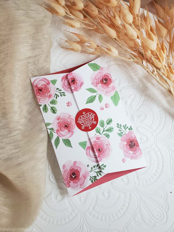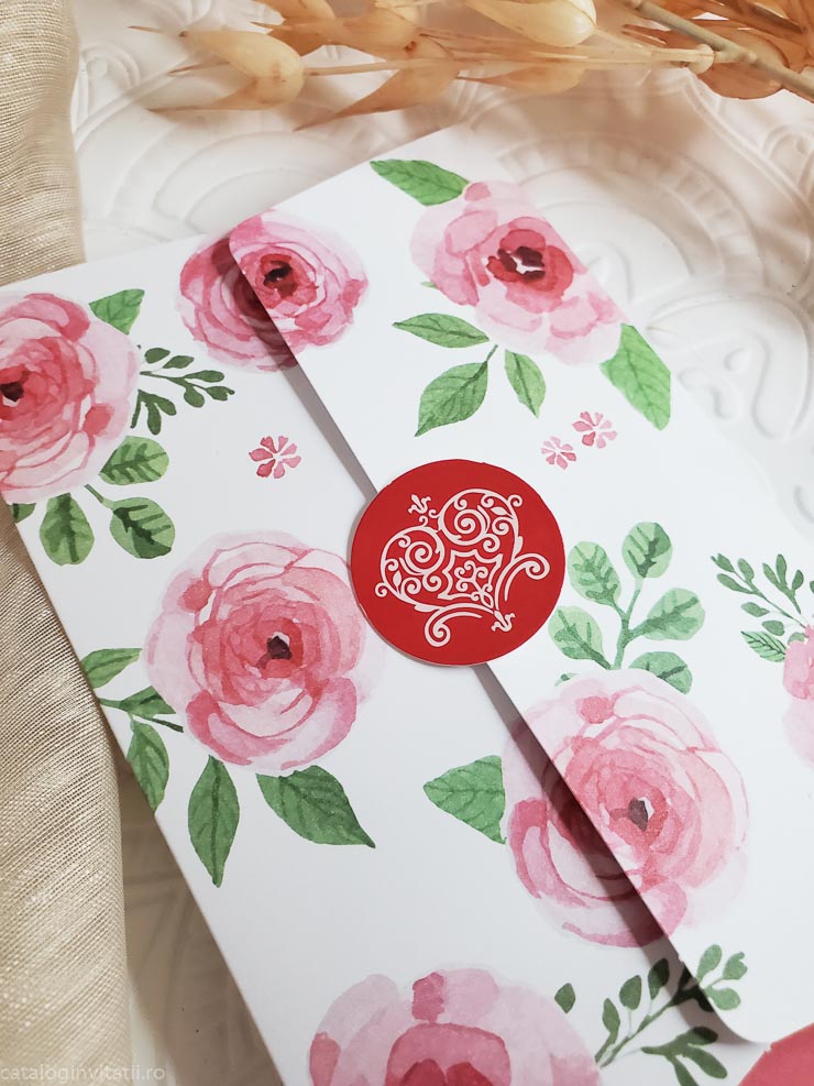 Invitație realizata dintr-un carton împăturit in trei părți inegale . Închisă invitația are la exterior un ornament floral din trandafiri cu efect de acuarela . Invitatia se inchide cu o pecete din carton ce are un ornament sub forma de inima stilizata. Nu are plic.