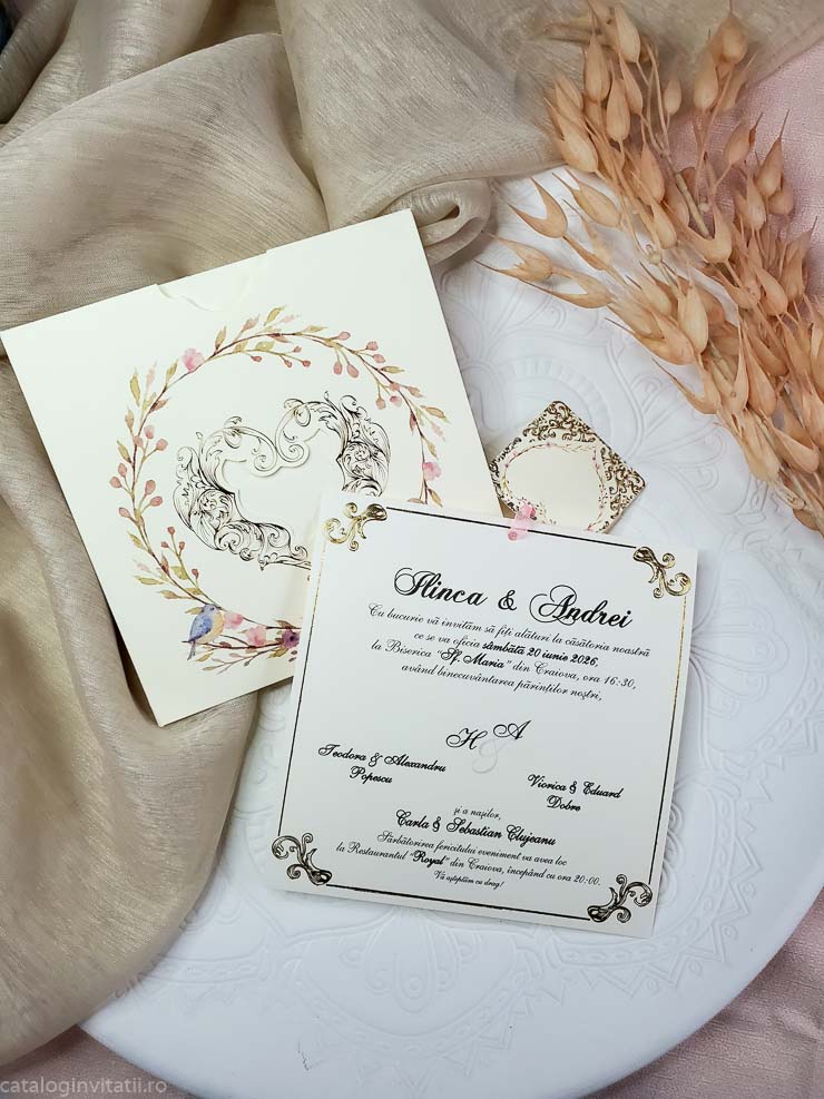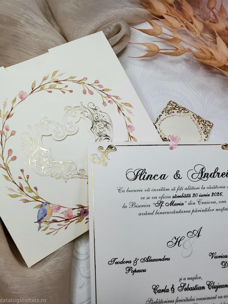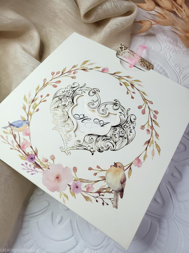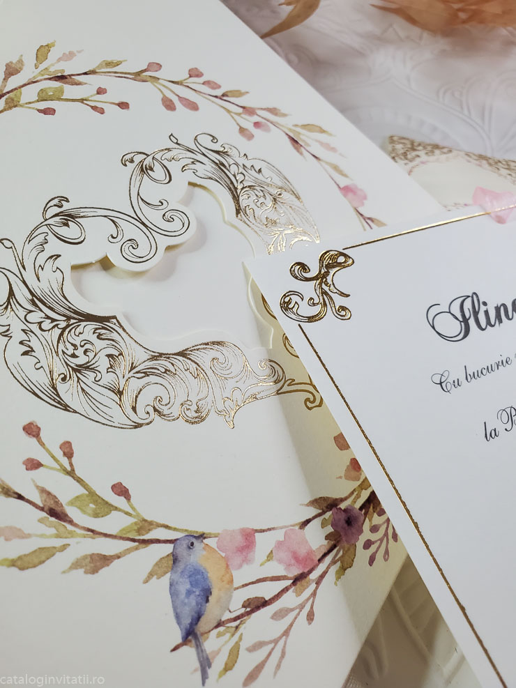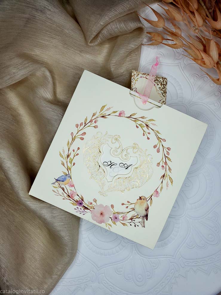 Invitație coroniță din ramuri înflorite si pasări mici 6037 este un model realiza din doua părți. Un carton suport ornat la exterior cu ramuri înflorite si doua pasări de talie mica un pițigoi și o pitulice reprezentate grafic prin tehnica acuarela. Cartonul text este ornat cu un chenar auriu și accesorizat cu bentiță din organza roz.