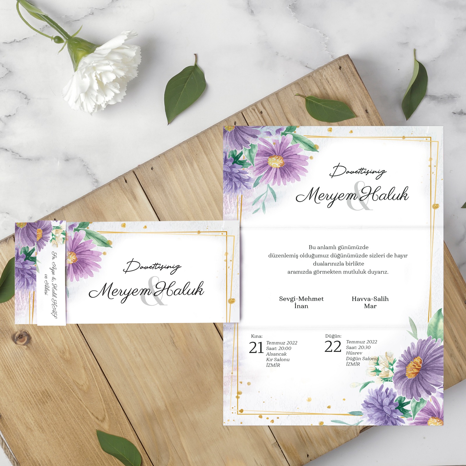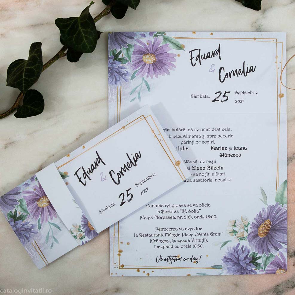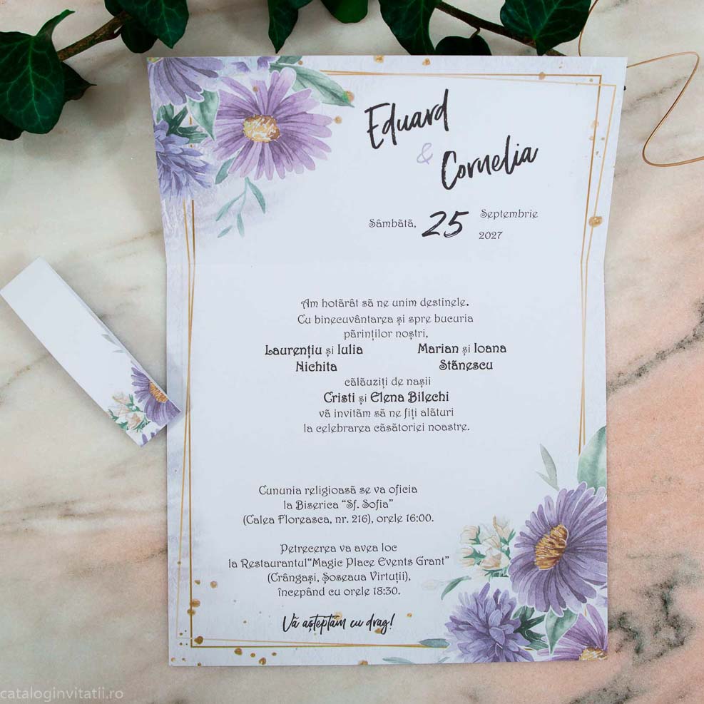 Florile de pe invitație sunt de culoare violet deschis și par a fi în plină floare.