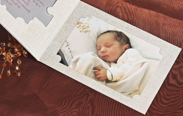 compusa din doua parti. Un carton suport ce se impatureste in doua pe orizontala, la care se ataseaza fotografia copilului cu dimensiunea 9cm / 13cm . Cartonul este decorat la exterior cu elemnte grafice ce reprezinta albinute, girafa, ursulet, ratusti, barbetuta, botosei,suzeta. Textul este tiparit pe calc (semi transparent) prin care se distinge fotografia copilui in background. Invitatia este insotita de un plic crem, plicul este inclus in pret.