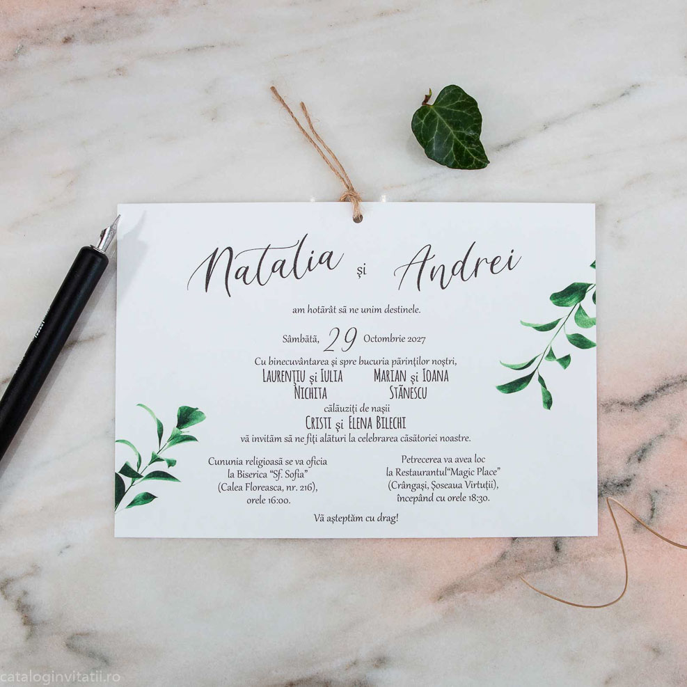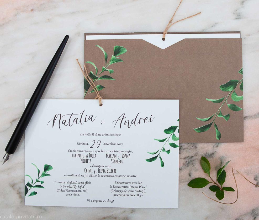 Această invitație de nuntă este decorată cu un design atrăgător de frunze verzi pe partea din față, adăugând o notă naturală și proaspătă. Este confecționată din carton de calitate. Invitația vine însoțită de un plic maro cu un decor vegetal verde, adăugând un element de eleganță și naturalețe. Combinarea frunzelor verzi și a fundalului maro creează un contrast plăcut, evidențiind astfel designul invitației.