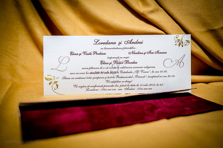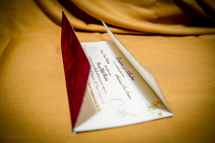 Invitație din catifea rosu Bordeaux cod 6039 este un model compus din doua părți un suport tip mapa realizat la exterior din catifea rosu Bordeaux si ornata cu model floral auriu cu reflexii metalice (folio). Mapa mai este accesorizată cu un brâu din plastic cu același model grafic auriu și o eticheta prinsa de acesta prin intermediu unui șnur auriu ce vine prins de piatra ornamentala ce imita diamantul.
