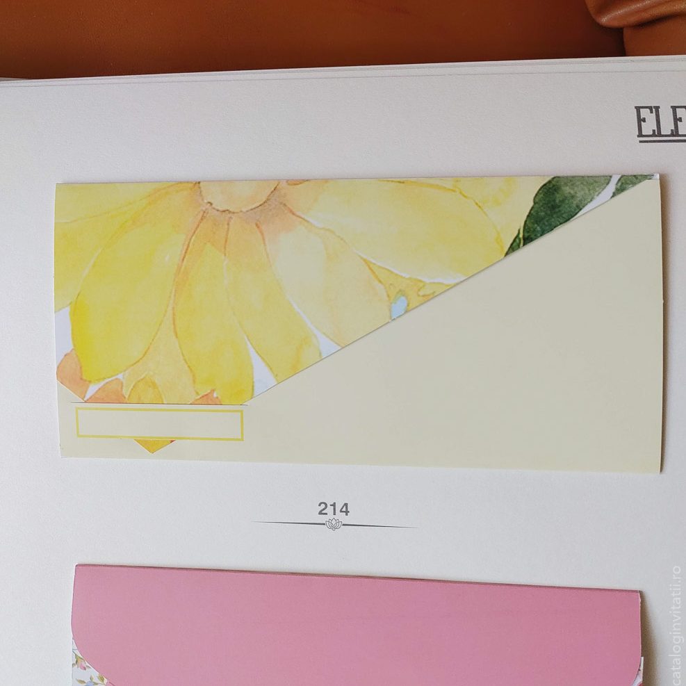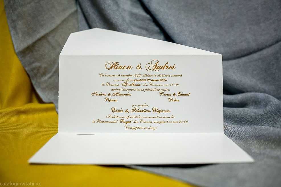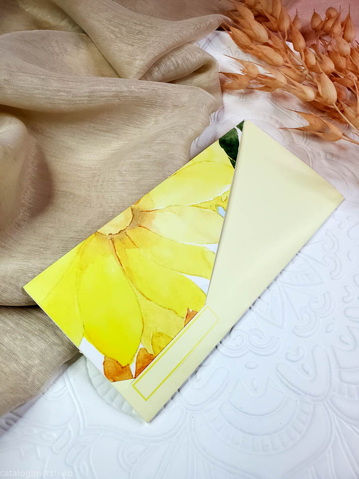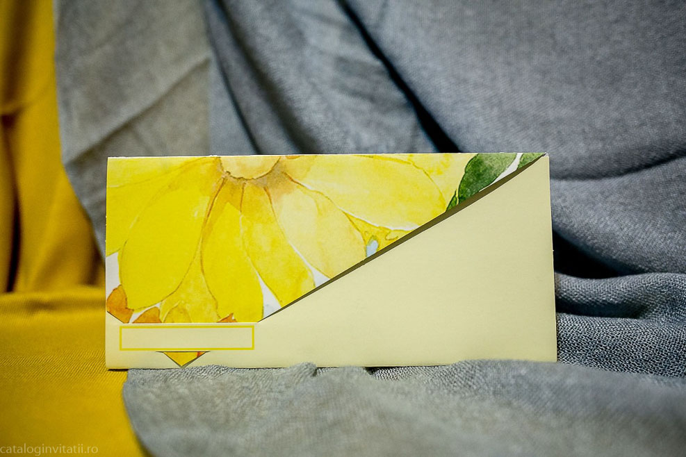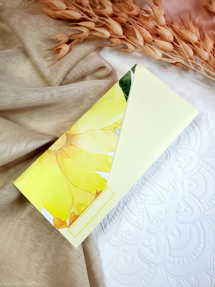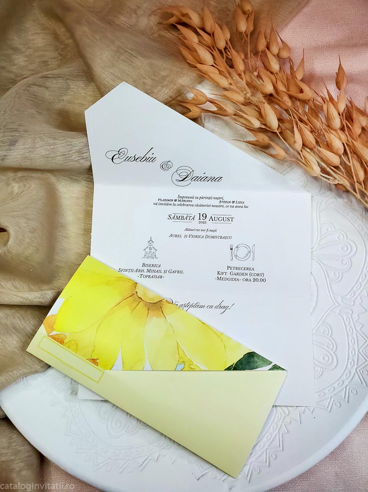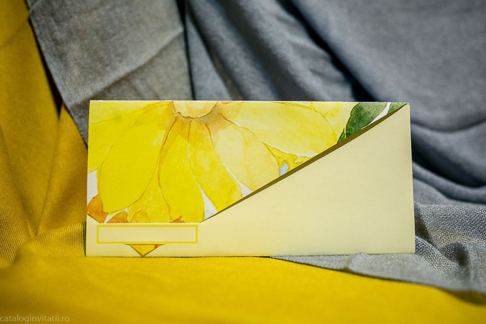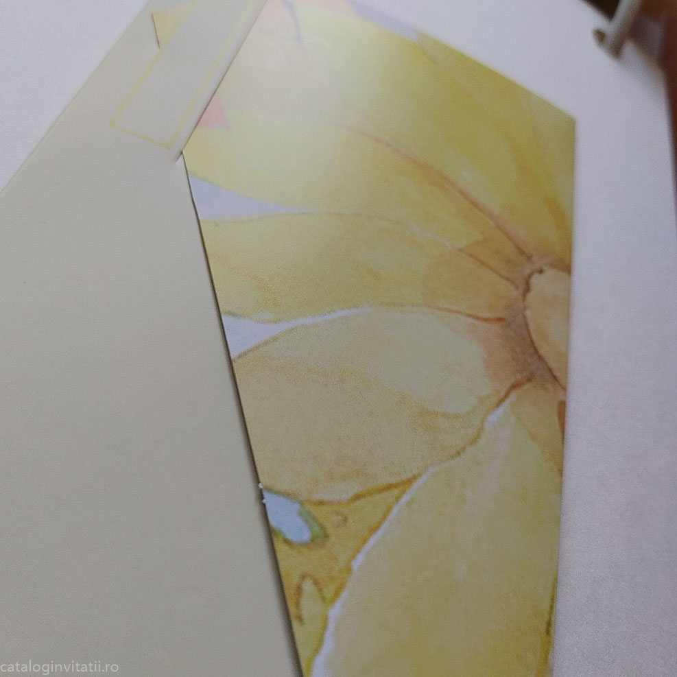 Invitația de nuntă este realizată din carton de calitate superioară, împăturită în trei pe orizontală. Pe partea din față se află o imagine simplă și elegantă, construită dintr–o floare cu petale galbene.Clapa superioara se inchide intr-un decupaj aflat pe partea inferioara Pe partea din interior se tiparesc toate informațiile necesare legate de eveniment, cum ar fi numele gazdelor, data și locația. Invitația poate fi personalizată în funcție de preferințele clientului.