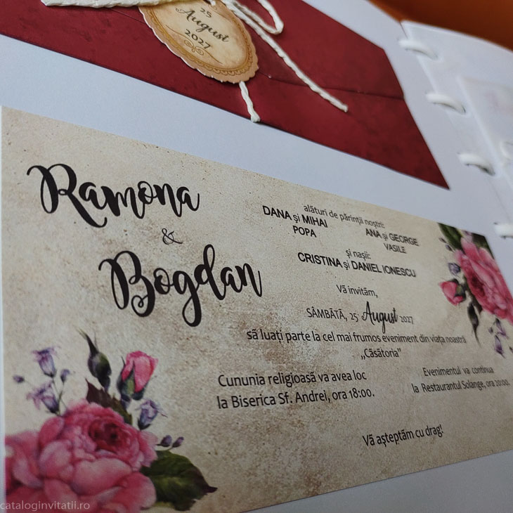 • cartonul text se introduce in mapa si invitația este accesorizata cu un șnur si eticheta pe care se trece data evenimentului.