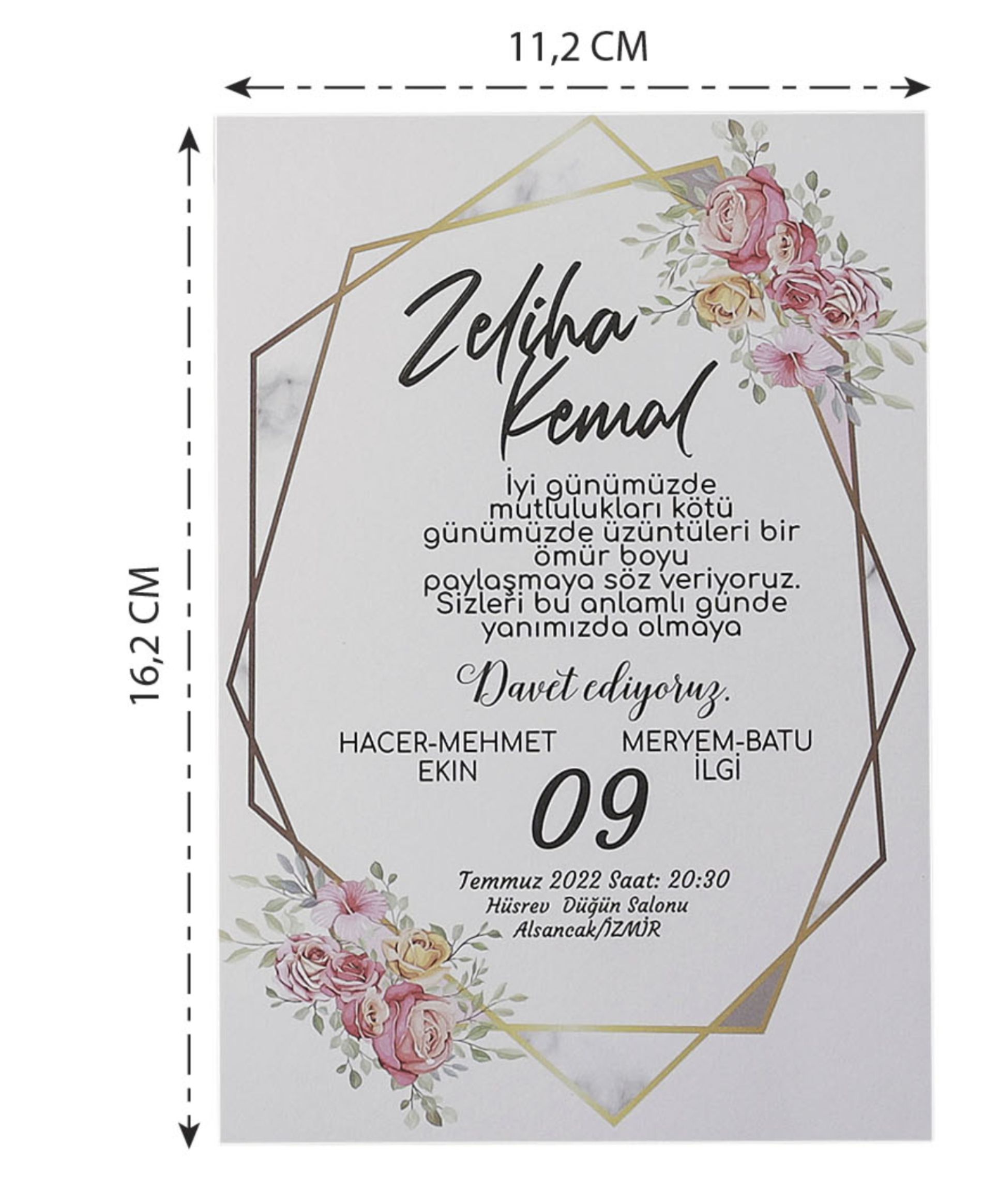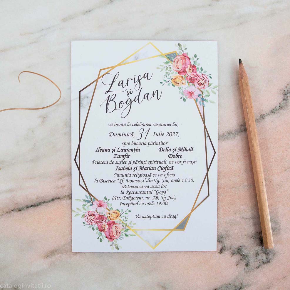 Această invitație de nuntă prezintă un design floral cu un model geometric în fundal. Invitația este scrisă cu font caligrafic Invitația este concepută cu accent pe designul floral. Invitația este realizată din carton de calitate . Invitația este potrivită pentru o varietate de evenimente, inclusiv nunți, logodne și alte ocazii speciale.