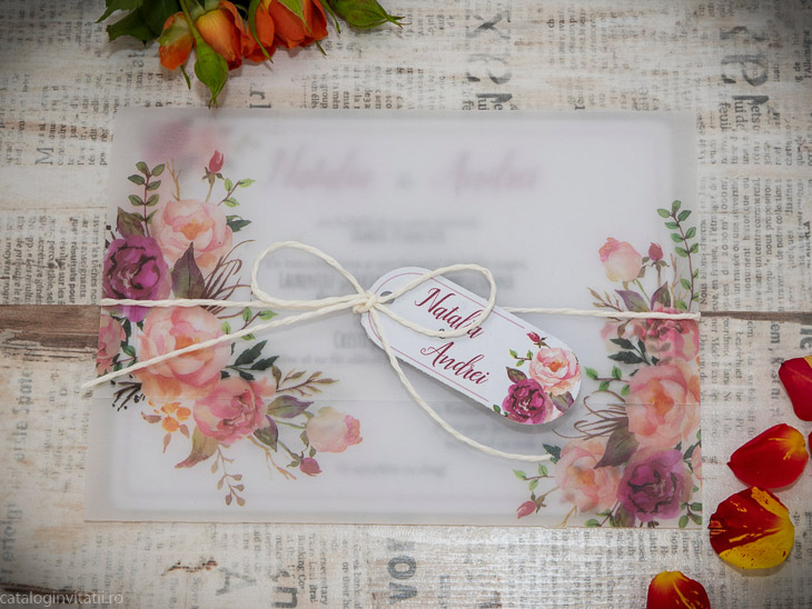 Invitatie florala eleganta 2255 este un model realizat din doua părți : un carton pentru text decorat cu model floral in acuarela si un calc lafel decorat cu model floaral din trandafiri.