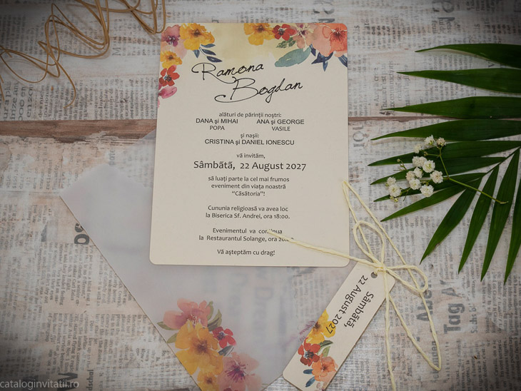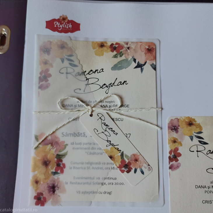 Invitatie florala rustica 2253 este un model realizat dintr-un carton decorat cu model floral si accesorizat cu snur , eticheta si calc.