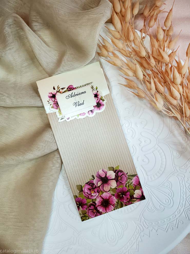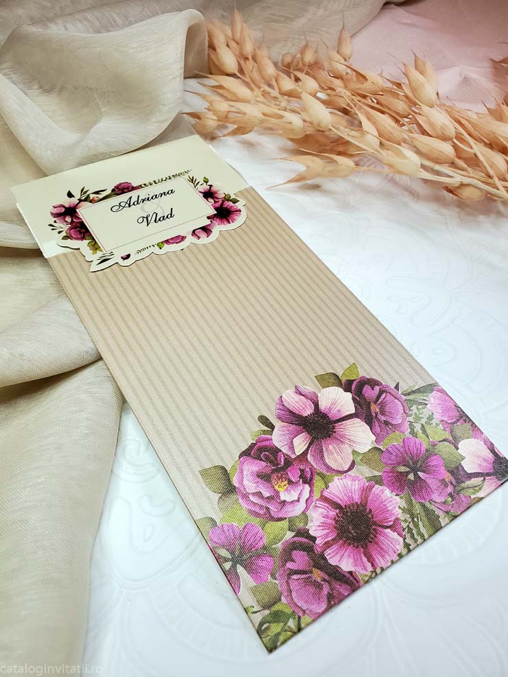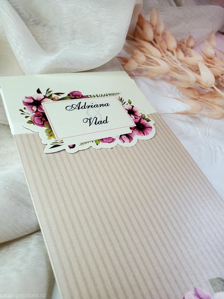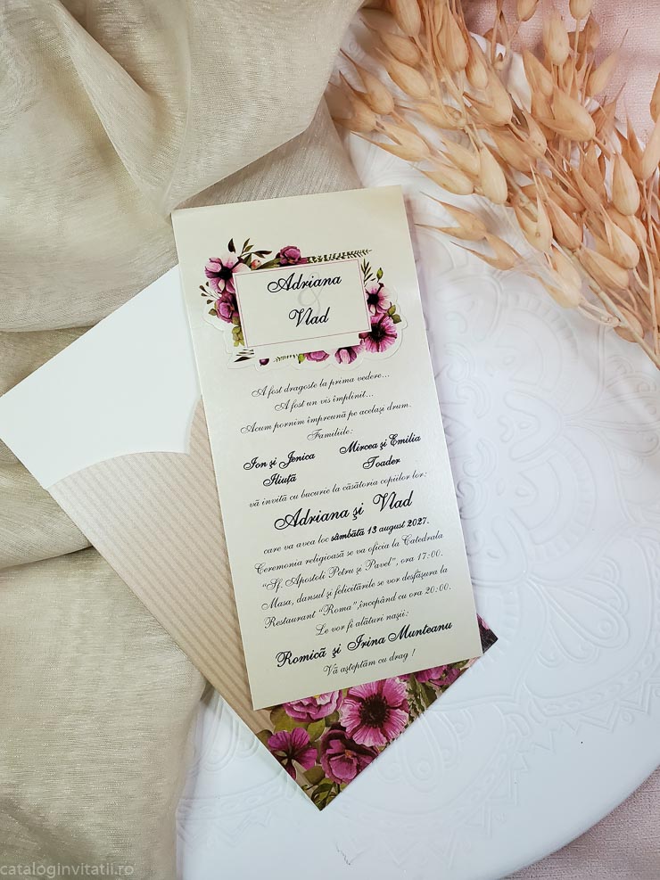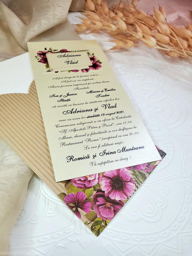 Invitatia cod 4016 este un model floral realizat din doua parti. Un carton texturat crem pentru text cu un decupaj cu chenar floral in care este trecut prenumele mirilor. Un suport tip teaca cu model floral in partea de jos. La mijloc este accesorizata cu o funda din hartie cu un medalion floral.