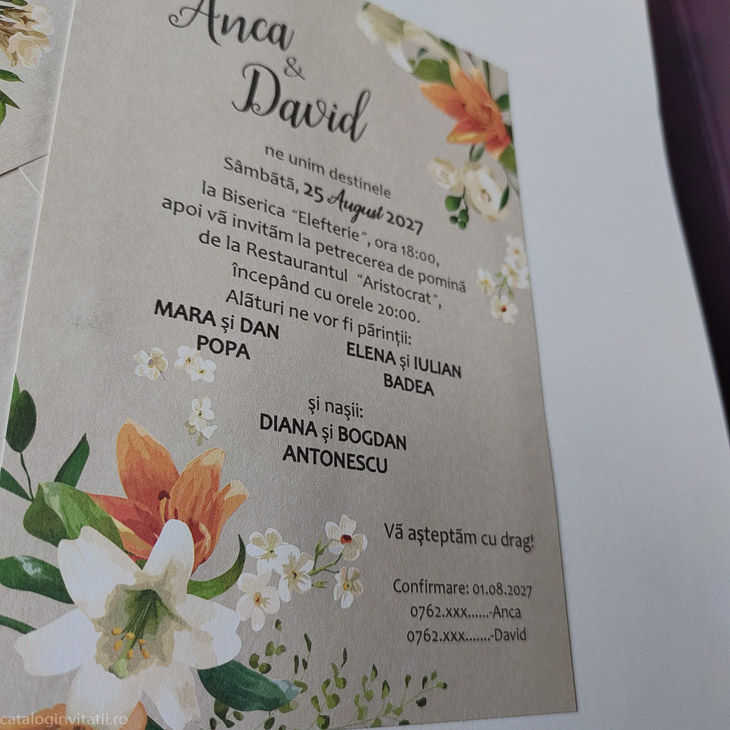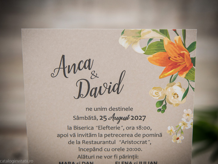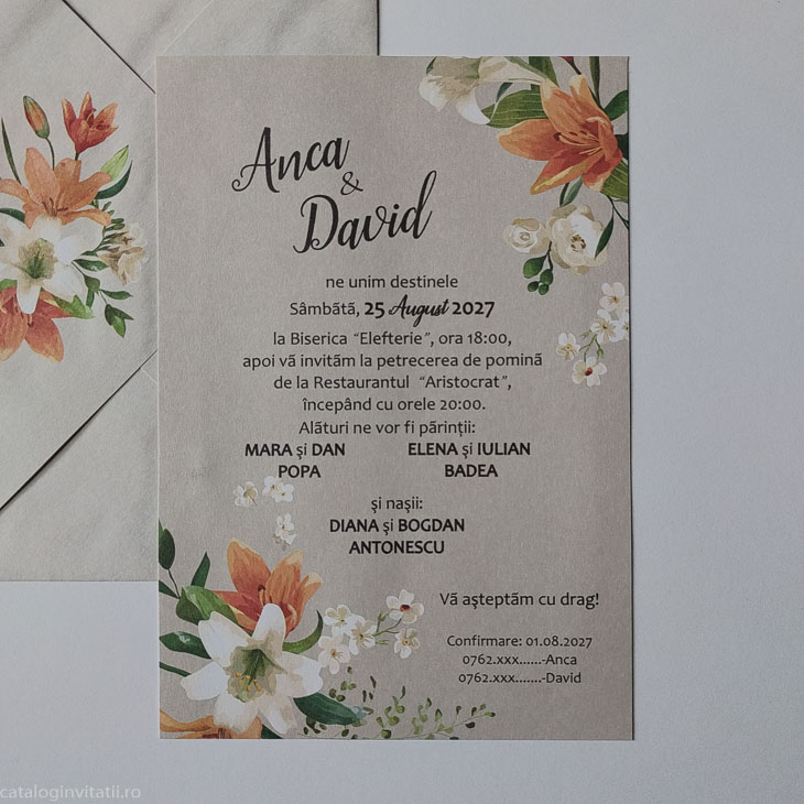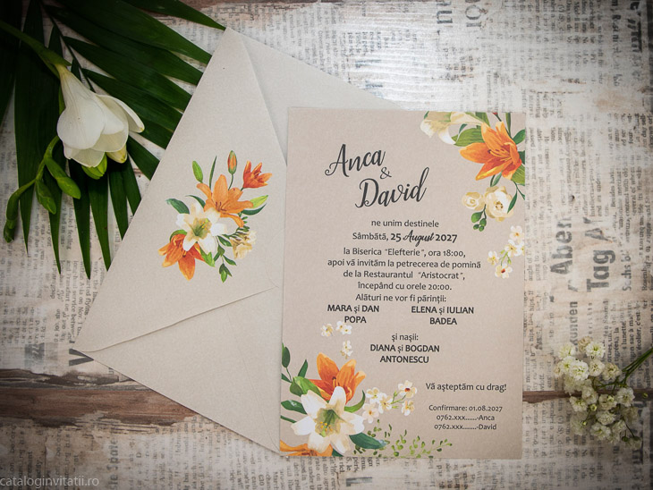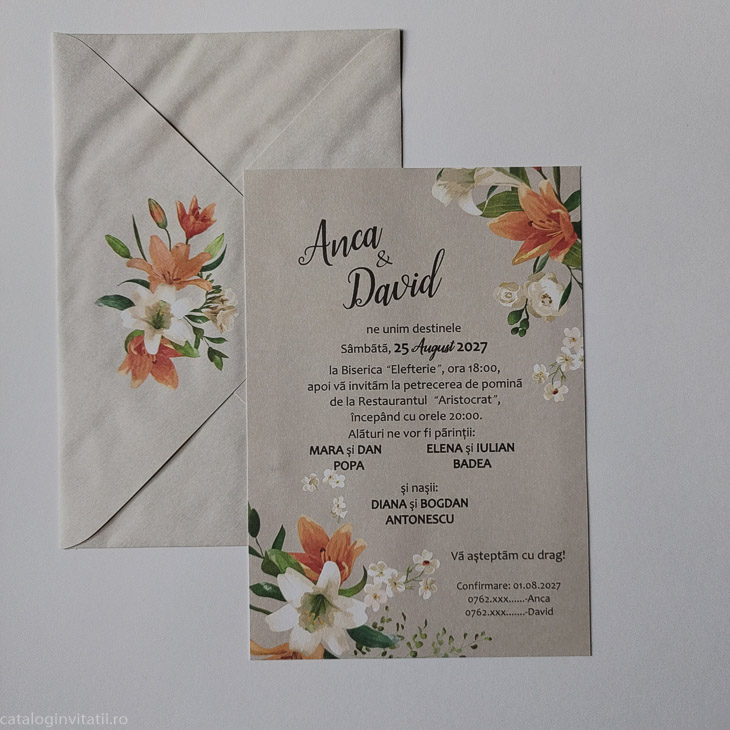 - un carton de culoare gri deschis (ivory) pentru text decorat cu model floral cu flori de crin portocaliu si alb