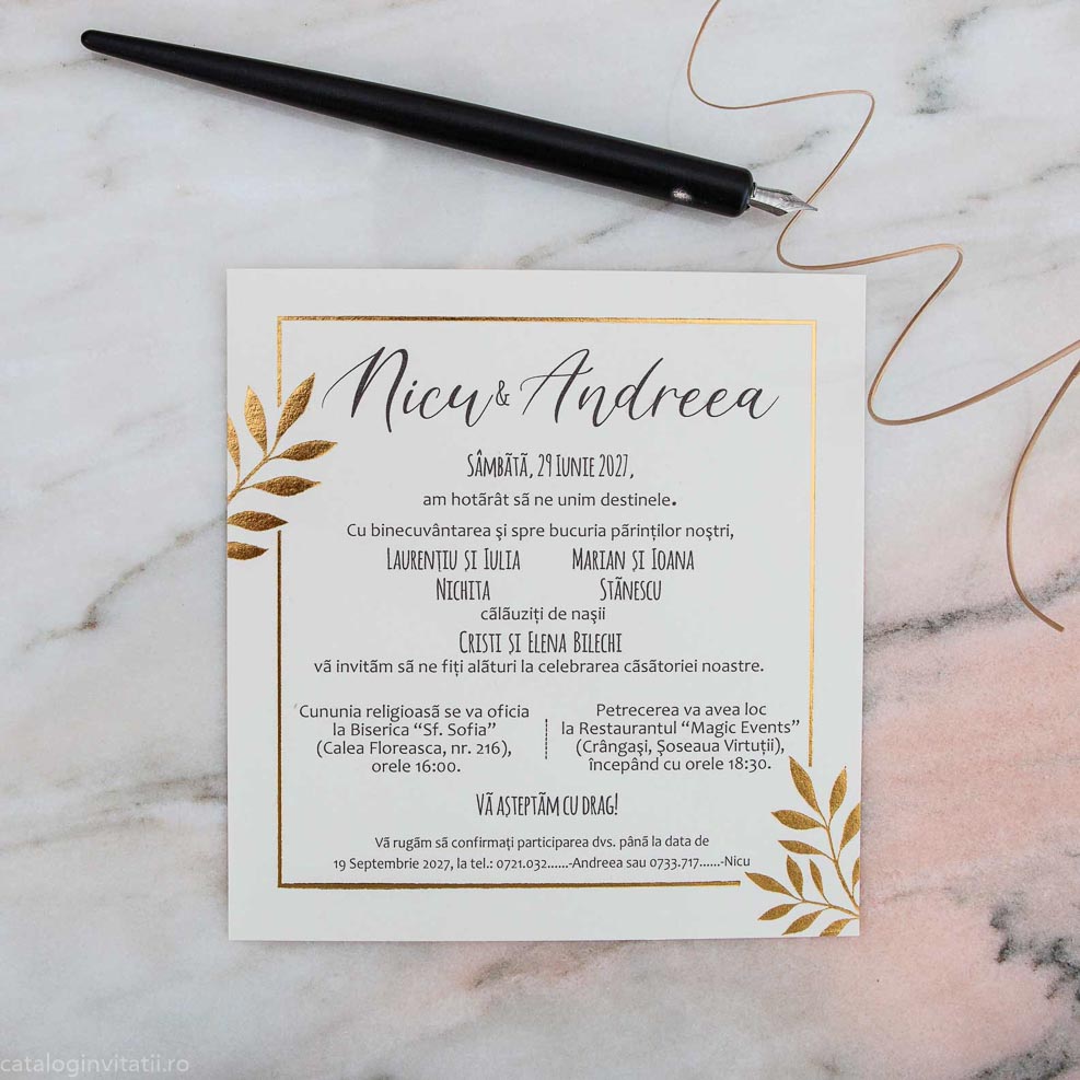 detaliu carton text si plic teacaAceasta este o invitație de nuntă cu un design în relief aurit pe partea frontală. Designul prezintă un motiv vegetal cu ramura de maslin. Invitația este pe o hârtie cartonată albă cu o bordură aurie. Partea din spate a invitației are data, ora și locația nunții scrise cu un font simplu. Plicul are un design în relief aurit. Invitația este elegantă și sofisticată, perfectă pentru o nuntă formală.