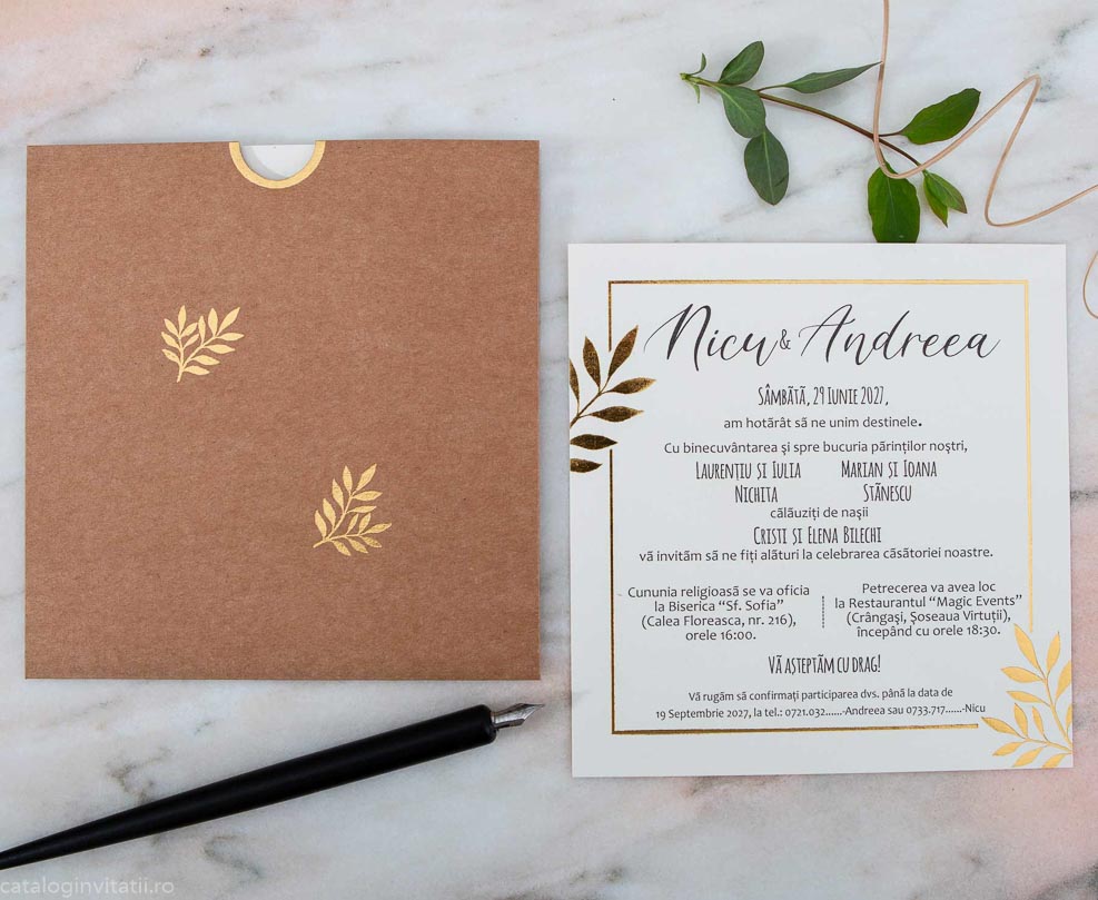 Aceasta este o invitație de nuntă cu un design aurit în relief pe partea frontală. Prezintă un motiv vegetal cu o ramură de măslin. Este tipărită pe hârtie albă cartonată cu o bordură aurie. Plicul este tip teaca si este realizat din carton reciclat.