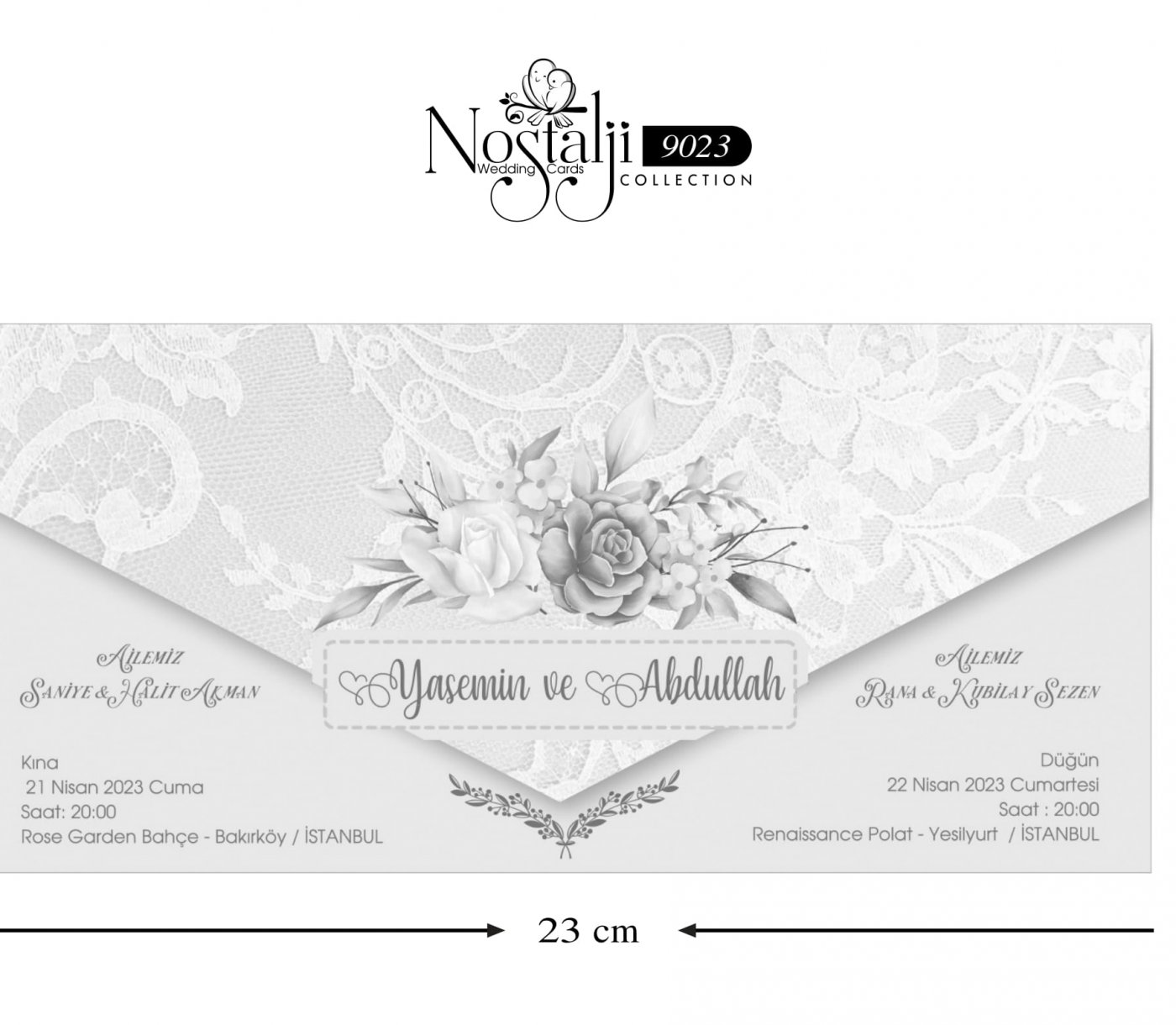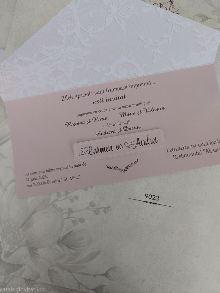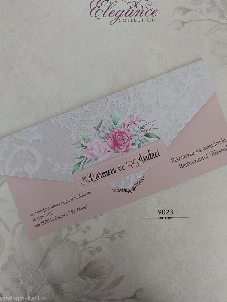 Invitație lace graphic 9023 este o invitație realizată dintr-un carton împăturit în două pe verticală decorată la exterior cu model grafic ce imită dantela florală și un buchet de trandafiri roz și roșu.