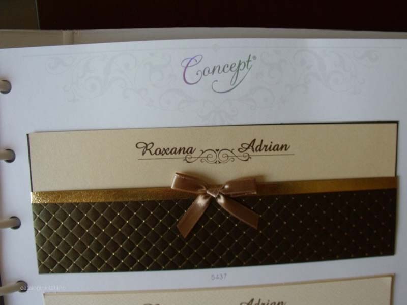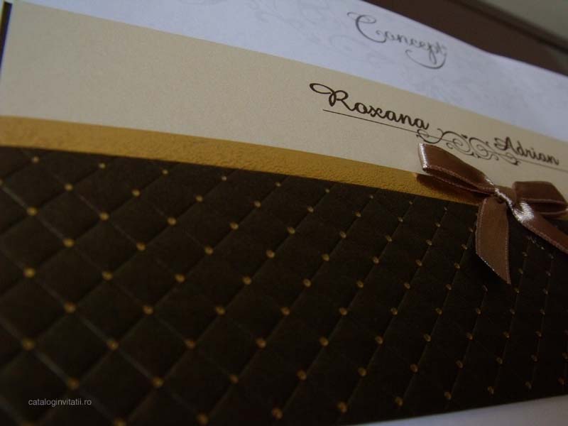 Modelul 5437 este alcătuit din doua parți un carton crem destinat textului si un carton suport maron ornamentat cu elemente grafice, carouri si o bordura metalica din material auriu. Cartonul text se introduce in cartonul suport, la mijloc invitatia are o funda ciocolatie din satin. Invitatia are forma unui plic si nu necesita plic suplimentar.