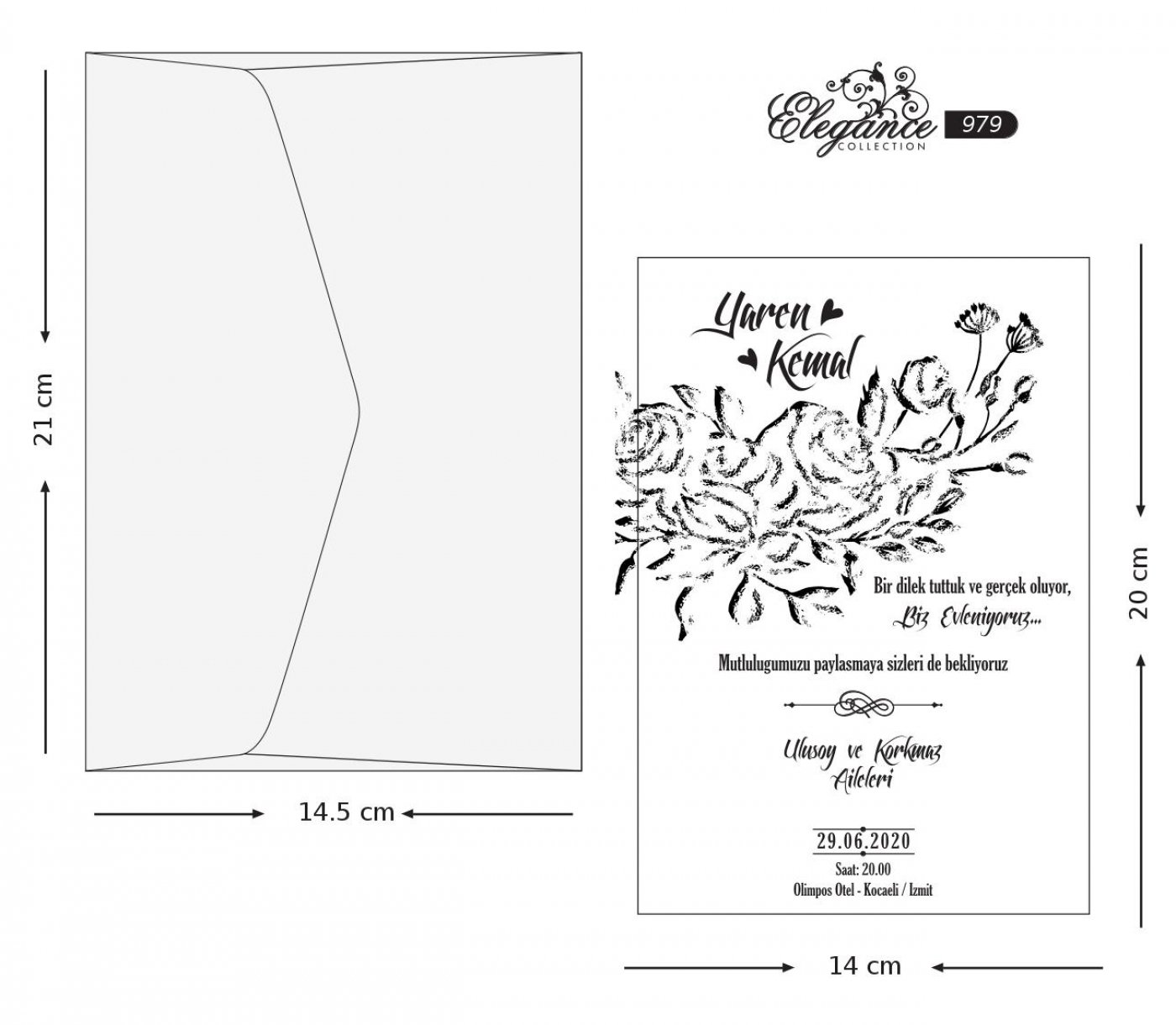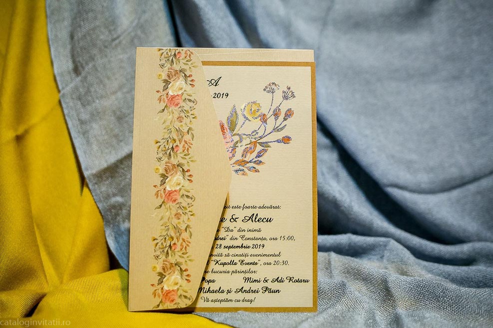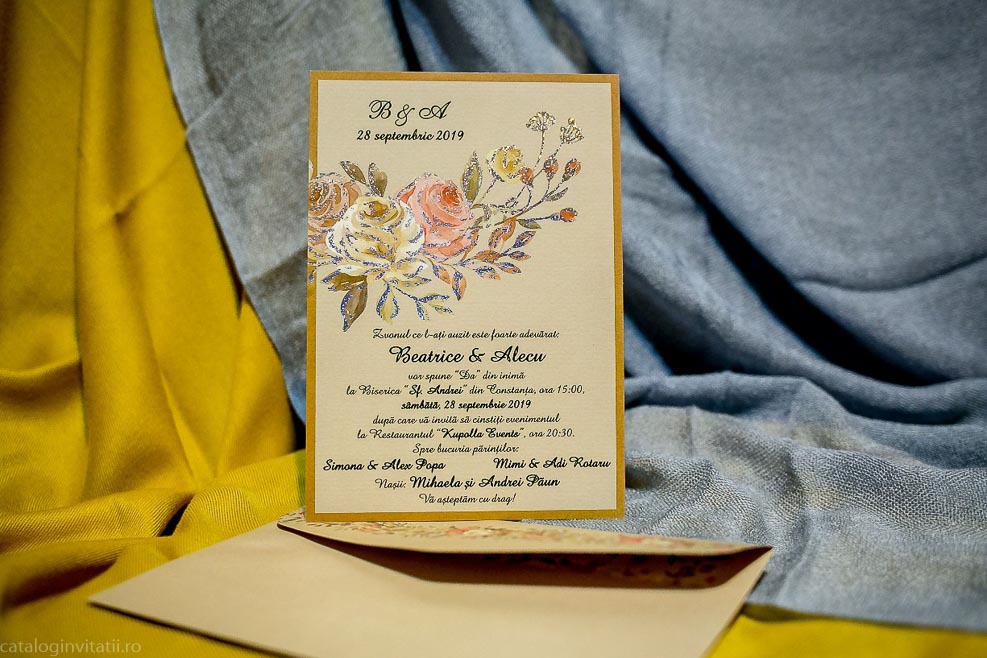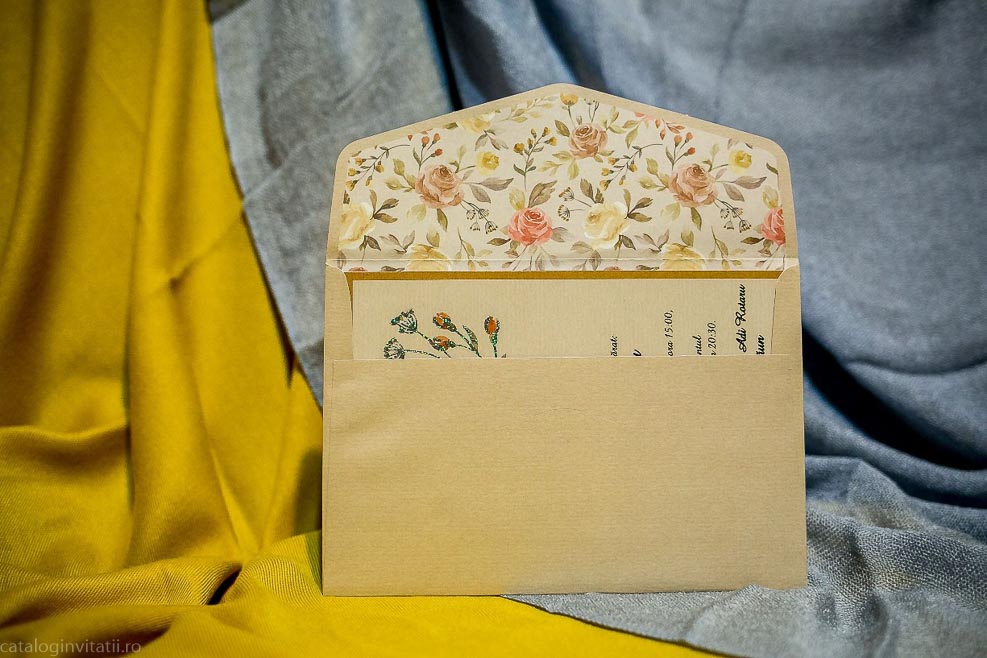 Invitatie maron trandafir 979 este un model realizat dintr-un carton ce imita cartonul reciclat decorat cu model floral din trandafiri