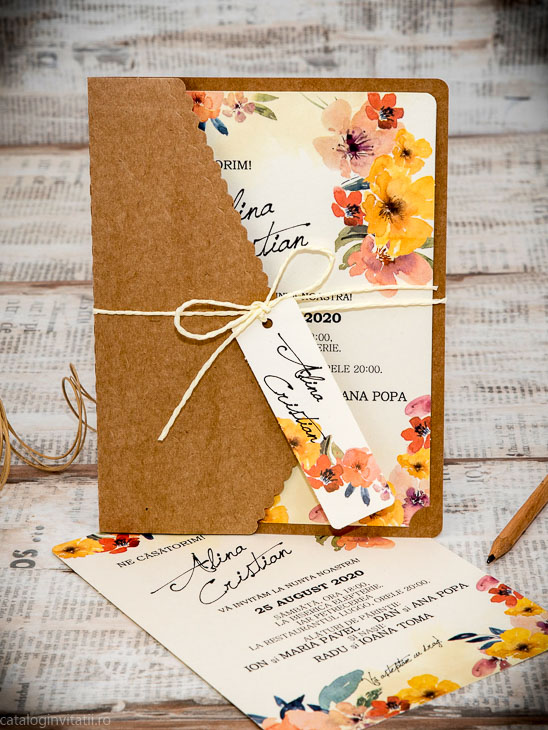 Invitatie model floral mapa carton reciclat 22301 este un model realizat din doua parti :