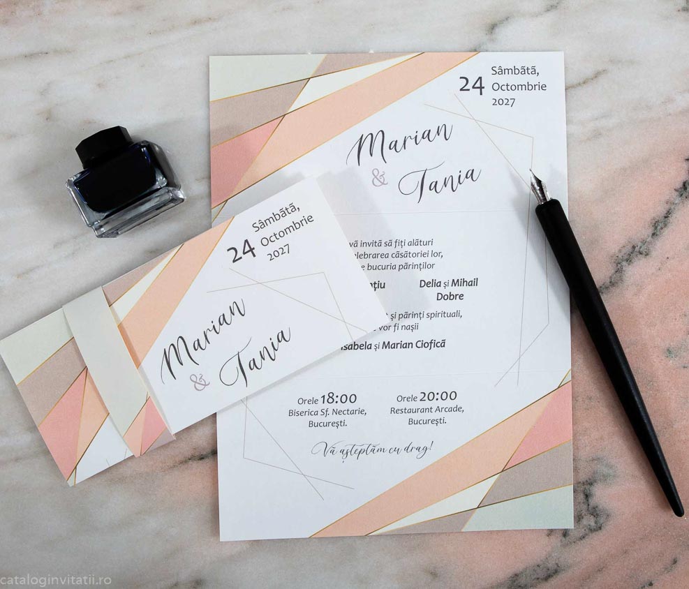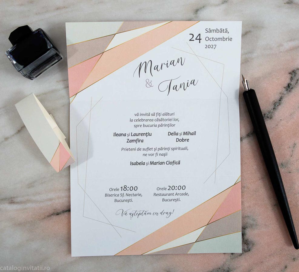 Această invitație de nuntă este un design modern și elegant, ce se impatureste in trei pe orizontala si este decorata cu un model geometric în nuanțe de roz somon și alb. Invitația prezintă un model geometric roz somon și alb pe coperta frontală, si chenare hexagonale care incadreaza textul ce se poate scrie pe cele trei laturi impaturire. Invitația este concepută pentru a fi elegantă și modernă, perfectă pentru o nuntă contemporană.