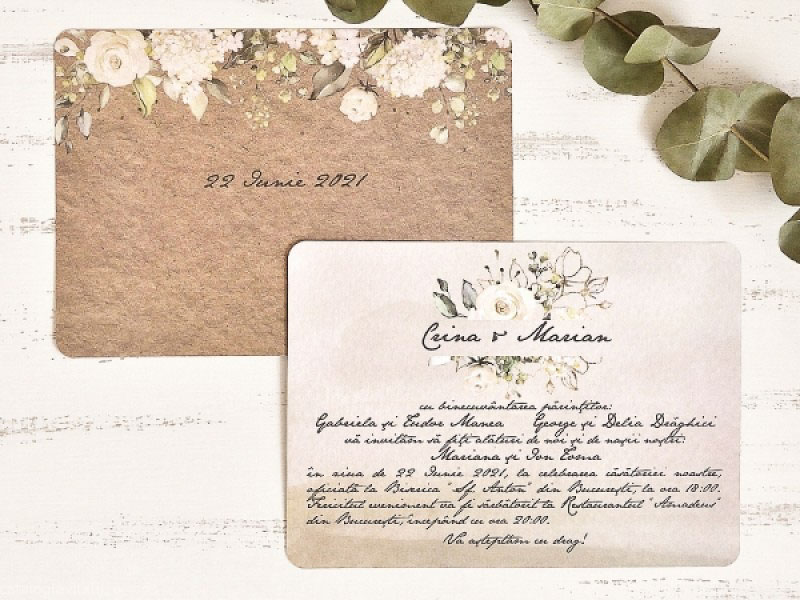 Un alt aspect remarcabil al invitației model rustic 39782 sunt elementele sale de decor. Imaginile prezente pe produsul afișat evidențiază atenția acordată detaliilor, cu motive rustice și naturale, care adaugă o notă de autenticitate și farmec aparte.