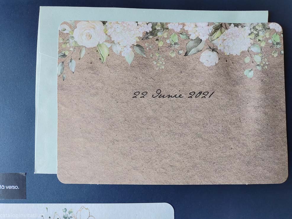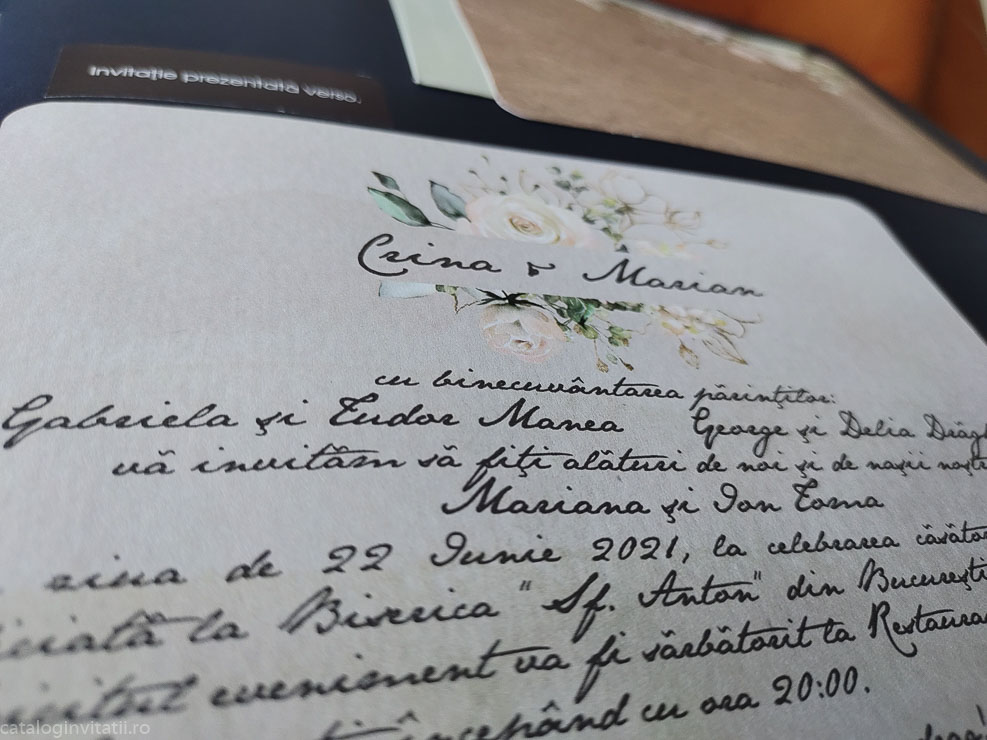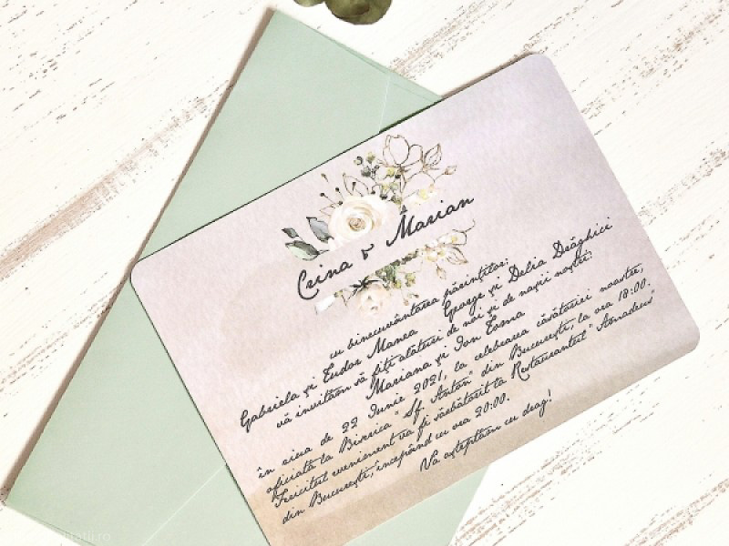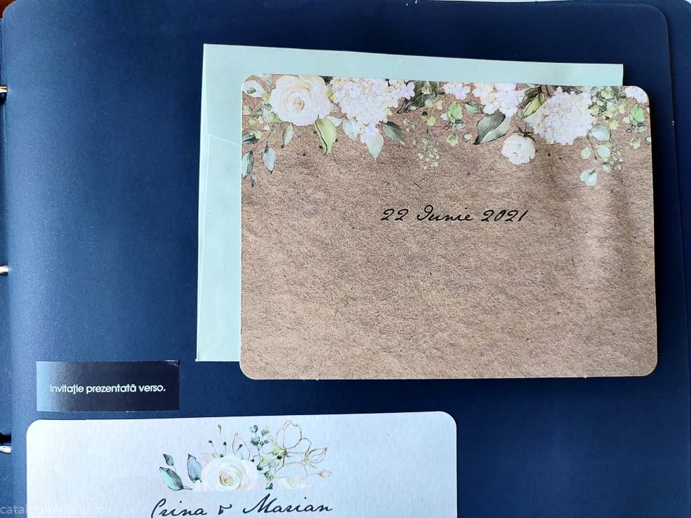 Invitația este livrată împreună cu un plic din prezentare într-o nuanță plăcută de verde deschis, care completează cu eleganță întregul ansamblu.