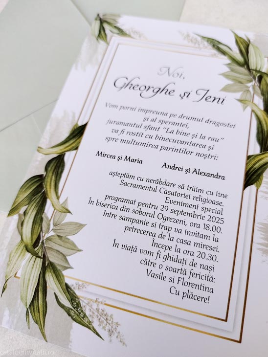 Invitație motiv vegetal verde 9037 este un model realizat dintr-un carton decorat cu model vegetal verde ce ornează chenarul central in care se încadrează textul invitației.