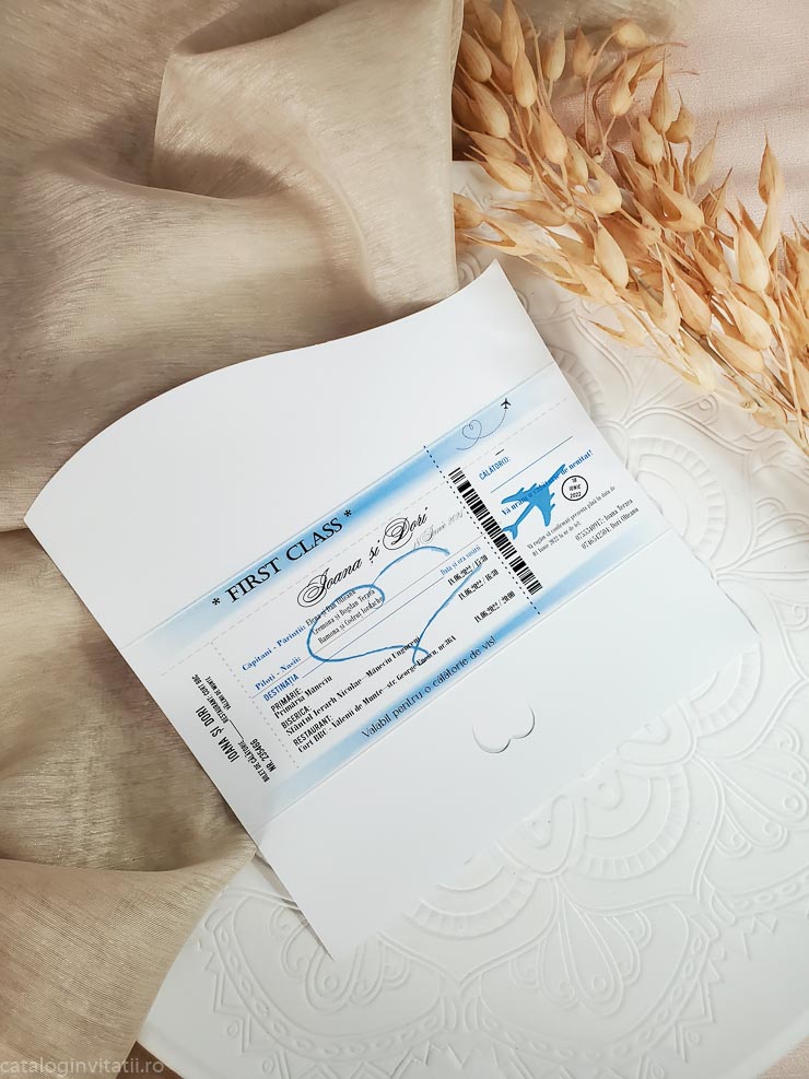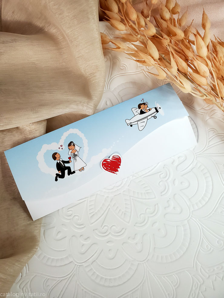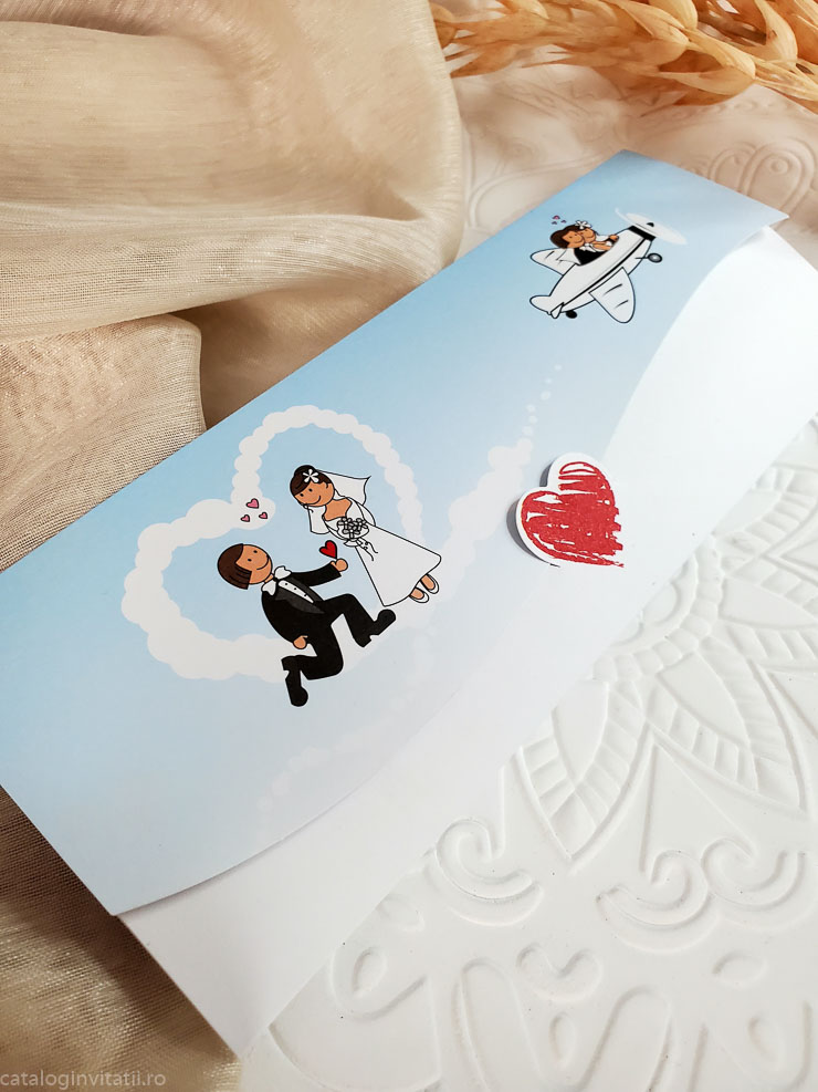 Invitație nuntă cod 5020 este un model realizat dintr-un carton împăturit în trei ce are la exterior un desen cu mirii într-o inimioara conturata de avionul în care cei doi pleacă în luna de miere.