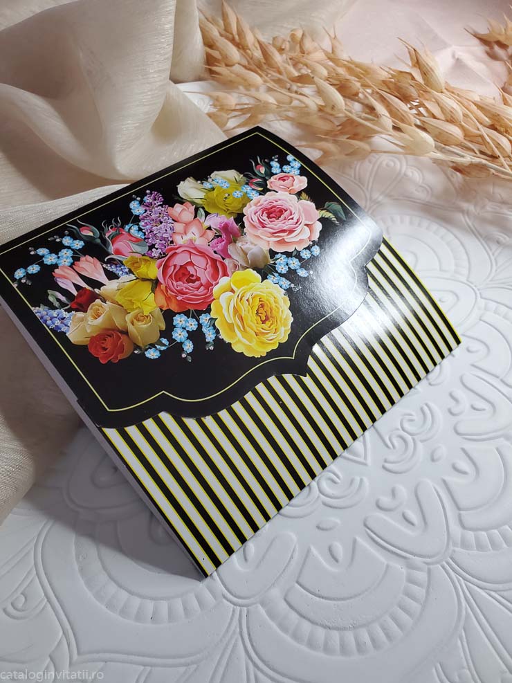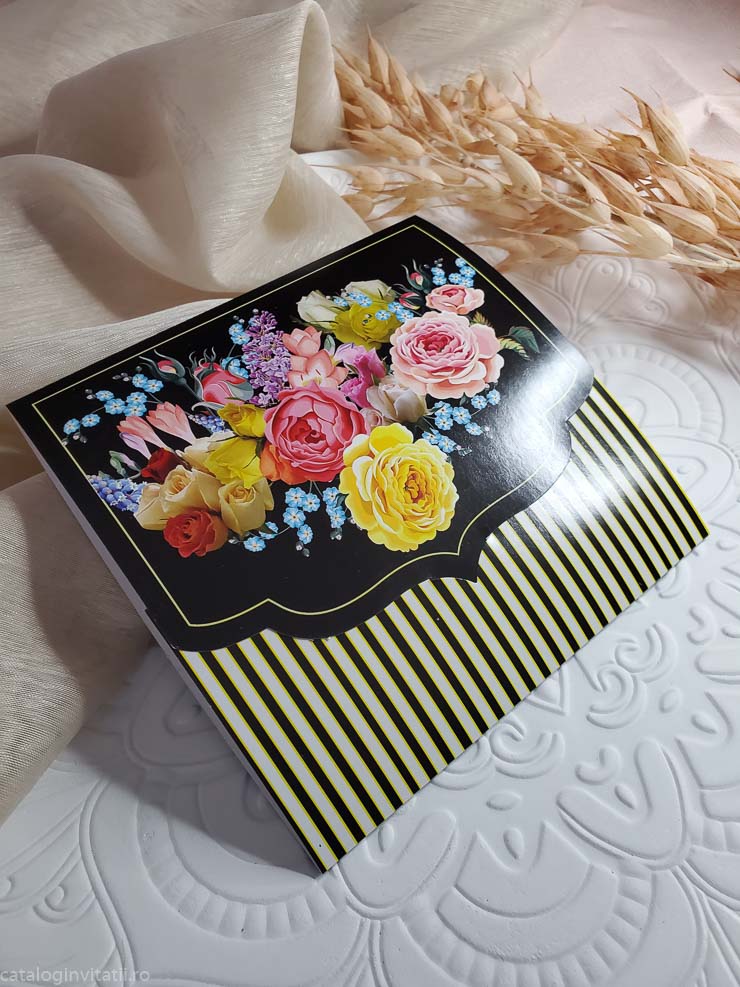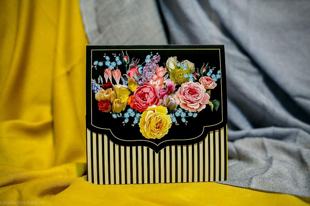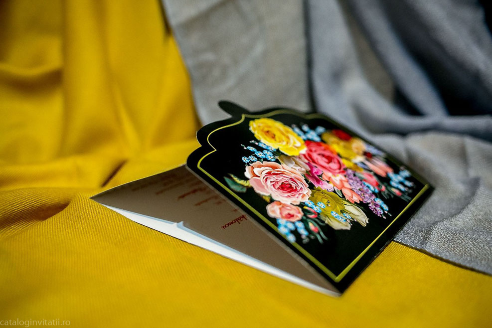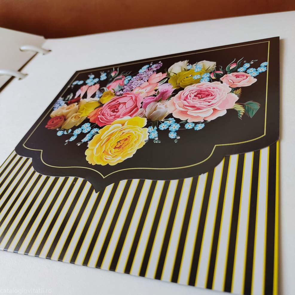 Invitatie ornament trandafiri multicolor 217 este sofisticată și elegantă, decorată cu trandafiri multicolori într-un aranjament artistic și vibrant, amplasat pe un fundal negru profund și misterios. Această invitație este perfectă pentru o nuntă plină de culoare și bucurie, aducând o notă de rafinament și eleganță evenimentului dvs. Fiecare invitație este personalizată cu numele dumneavoastră și data nuntii, cu fonturi elegante și subtile striatii negre, așezate cu atenție pentru a crea un efect deosebit de atrăgător. În plus, clapa interioară cu striatii negre adaugă o notă de lux invitației dvs. și oferă un spațiu suplimentar pentru detalii importante despre evenimentul dvs. Nu lăsați să vă scape această invitație fermecătoare, care va impresiona cu siguranță invitații la nunta dvs.!