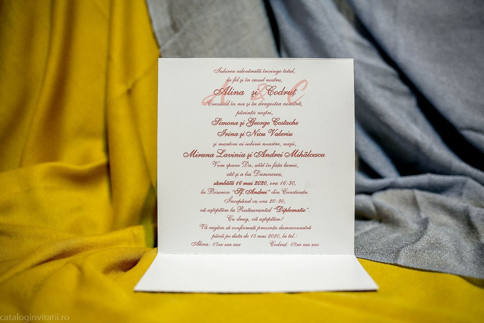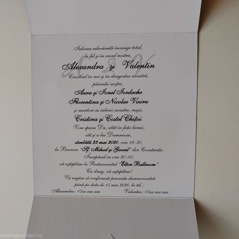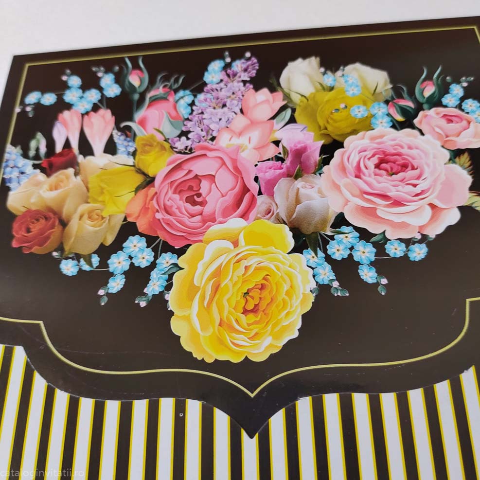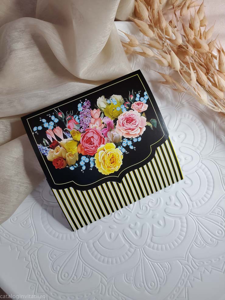 Invitatie ornament trandafiri multicolor 217 este sofisticată și elegantă, decorată cu trandafiri multicolori într-un aranjament artistic și vibrant, amplasat pe un fundal negru profund și misterios. Această invitație este perfectă pentru o nuntă plină de culoare și bucurie, aducând o notă de rafinament și eleganță evenimentului dvs. Fiecare invitație este personalizată cu numele dumneavoastră și data nuntii, cu fonturi elegante și subtile striatii negre, așezate cu atenție pentru a crea un efect deosebit de atrăgător. În plus, clapa interioară cu striatii negre adaugă o notă de lux invitației dvs. și oferă un spațiu suplimentar pentru detalii importante despre evenimentul dvs. Nu lăsați să vă scape această invitație fermecătoare, care va impresiona cu siguranță invitații la nunta dvs.!