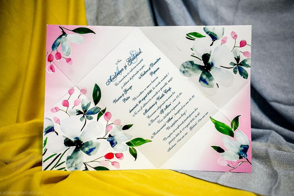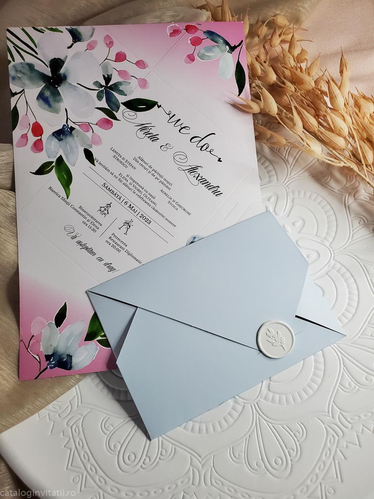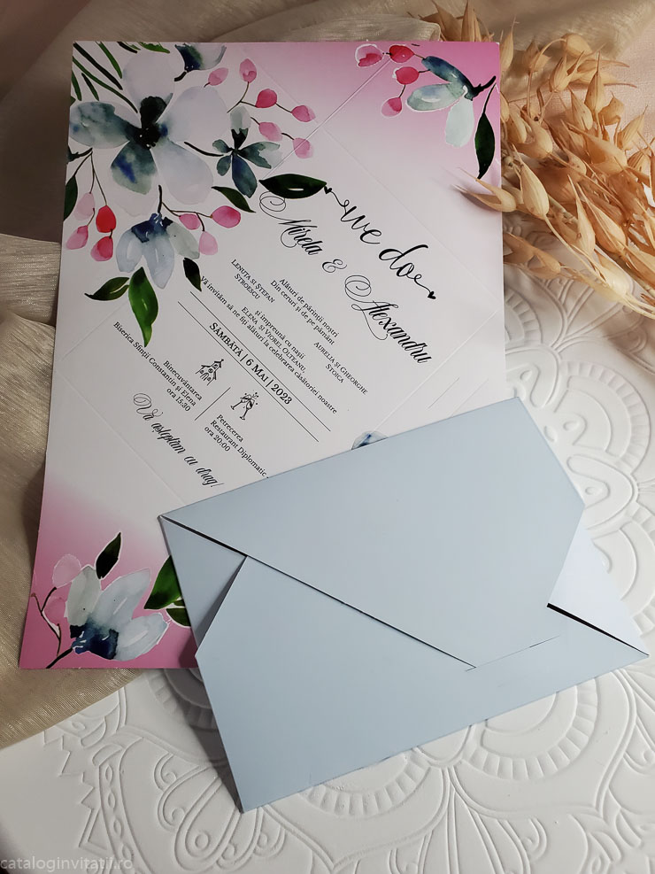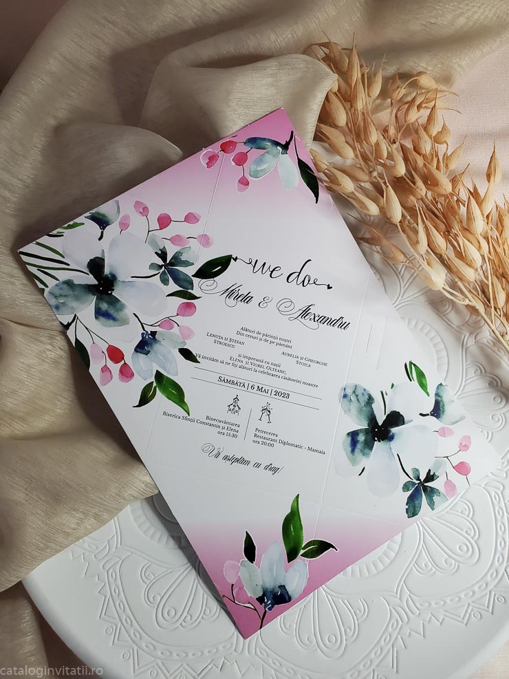 Această invitație la nuntă este o bucată de carton frumos proiectată, cu un model floral pe față. Designul prezintă o ilustrație în stil aquarelă a florilor și frunzelor în nuanțe de roz, albastru și verde. Invitația este pliată în patru parti.