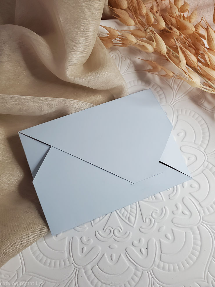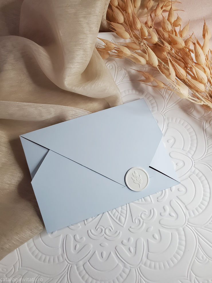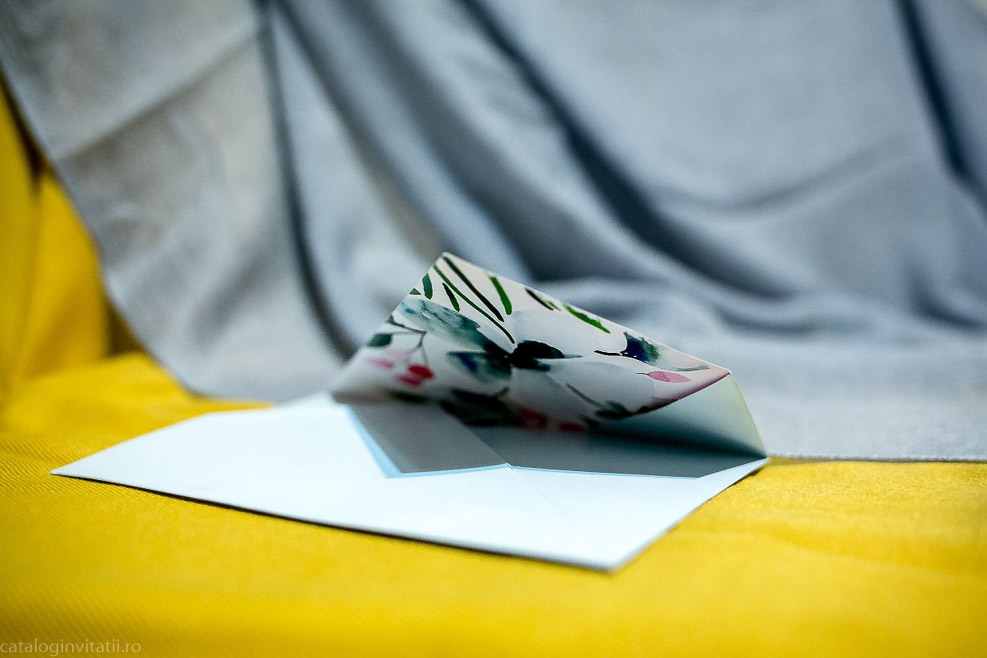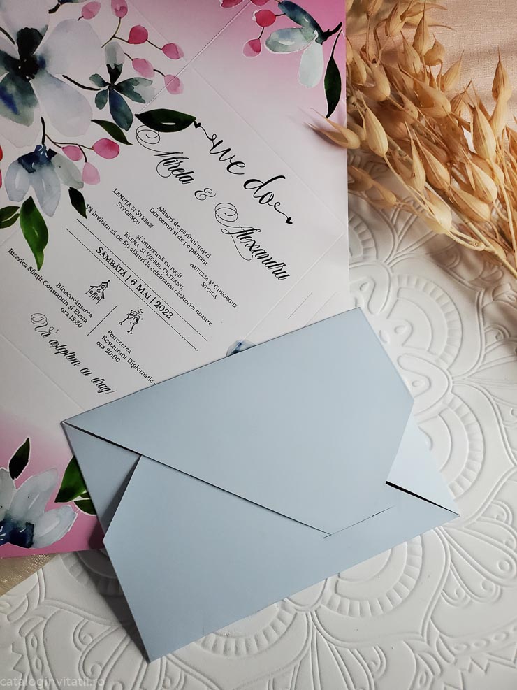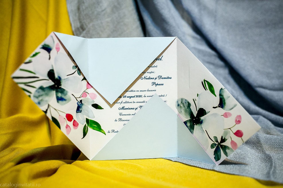 Această invitație la nuntă este o bucată de carton frumos proiectată, cu un model floral pe față. Designul prezintă o ilustrație în stil aquarelă a florilor și frunzelor în nuanțe de roz, albastru și verde. Invitația este pliată în patru parti.