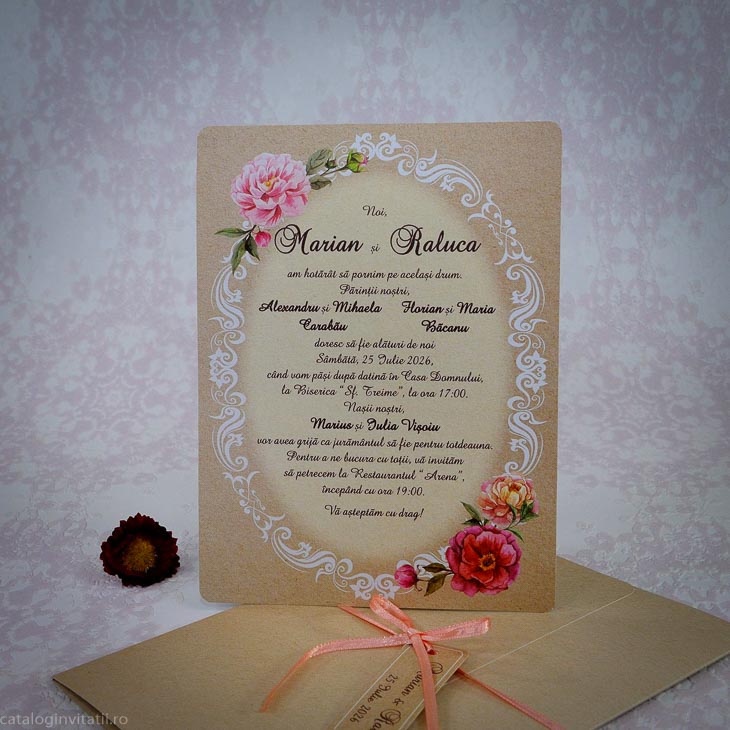 Invitație recycled paper 2215 este un model floral realizat dintr-un carton reciclat dedicat textului care este ornat flori dispuse pe chenarul rotund. Textul se scrie în chenarul din mijloc. cartonul text se introduce în mapa accesorizata cu șnur si eticheta.