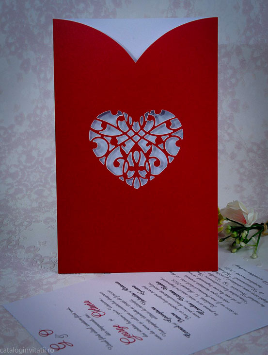 Invitatie red heart decoupage 2216 este un model realizat din doua parți . Un carton rosu tip teaca in care se introduce cartonul alb ce conține textul. Cartonul teaca are pe partea centrala un decupaj în laser ce conturează o inimioara.