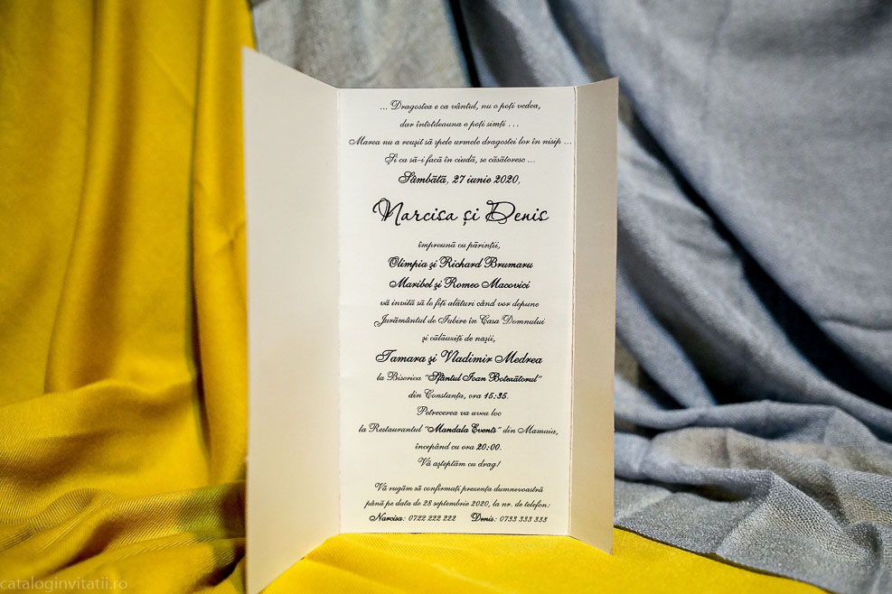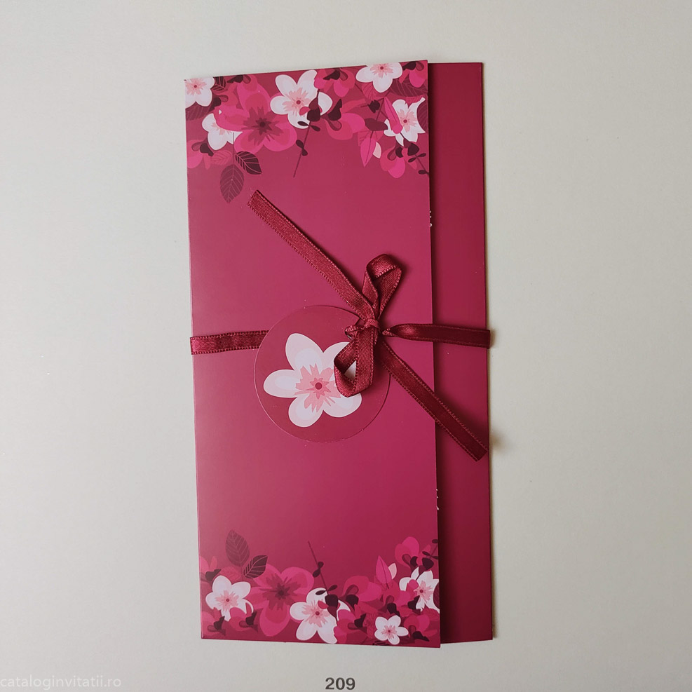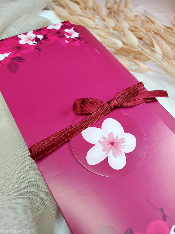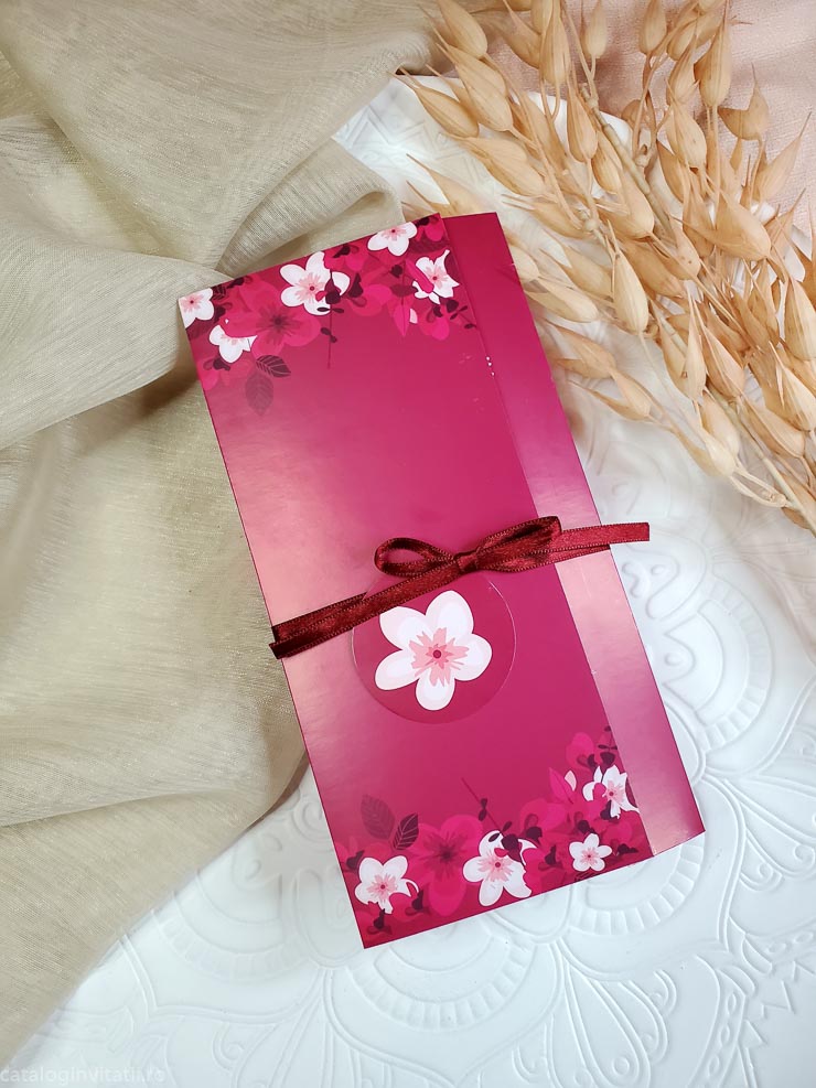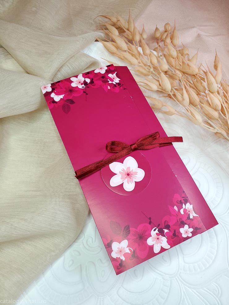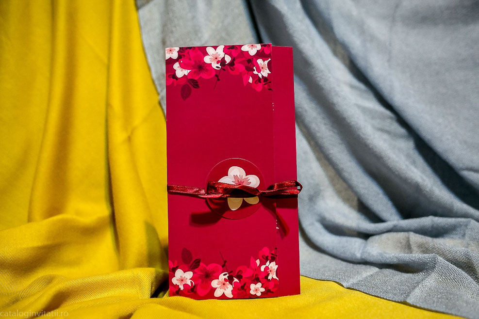 Acesta Invitația de nuntă are un model floral roșu si se impatureste in trei pe verticala. Invitatie este accesorizată cu un snur textil rosu prins într-o bulină cu floare cu petale. Este o alegere elegantă și romantică pentru nunta ta.
