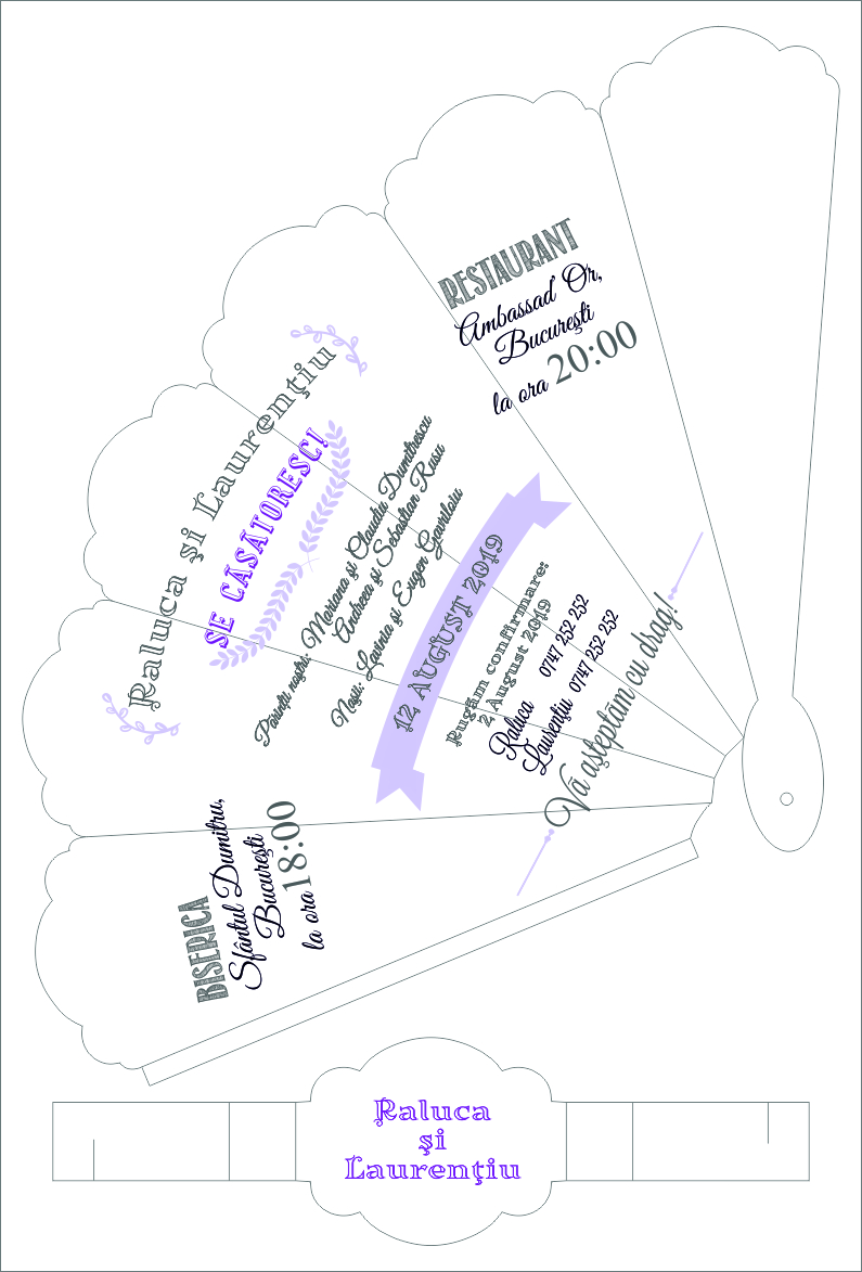Evantaiul are sapte pliuri din care cinci poti fi personalizate cu text. Primul pliu este ornamentat cu elemente florale decupate laser si la mijloc apare silueta miresei si mirelui ce stau fata in fata.