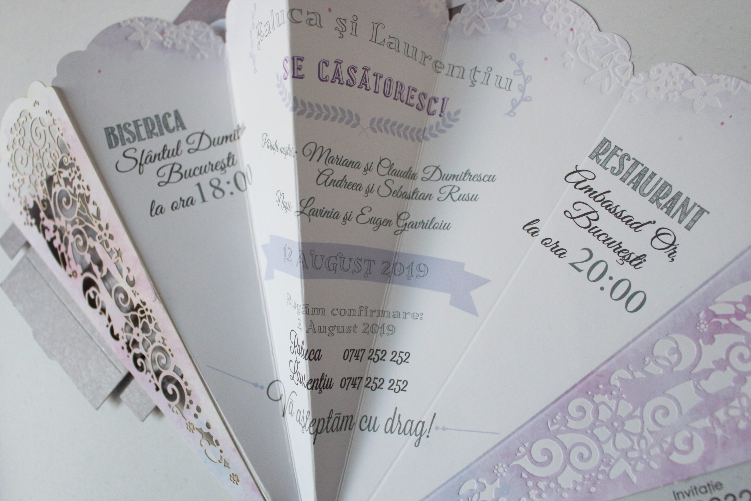 Invitatie sub forma de evantai de culoarea lavandei