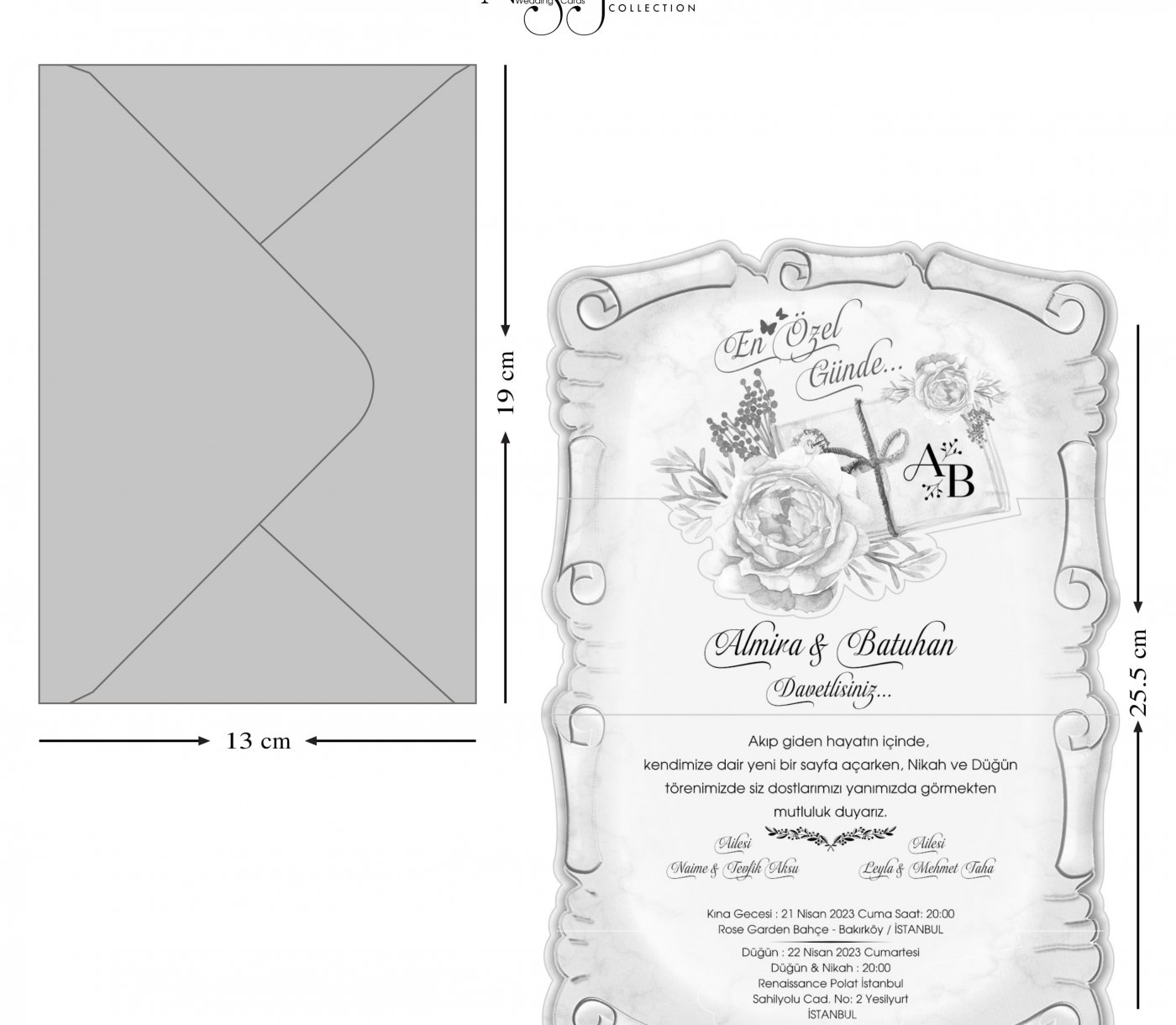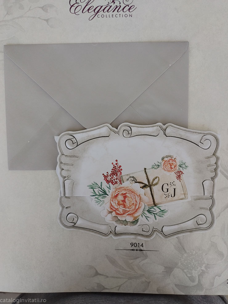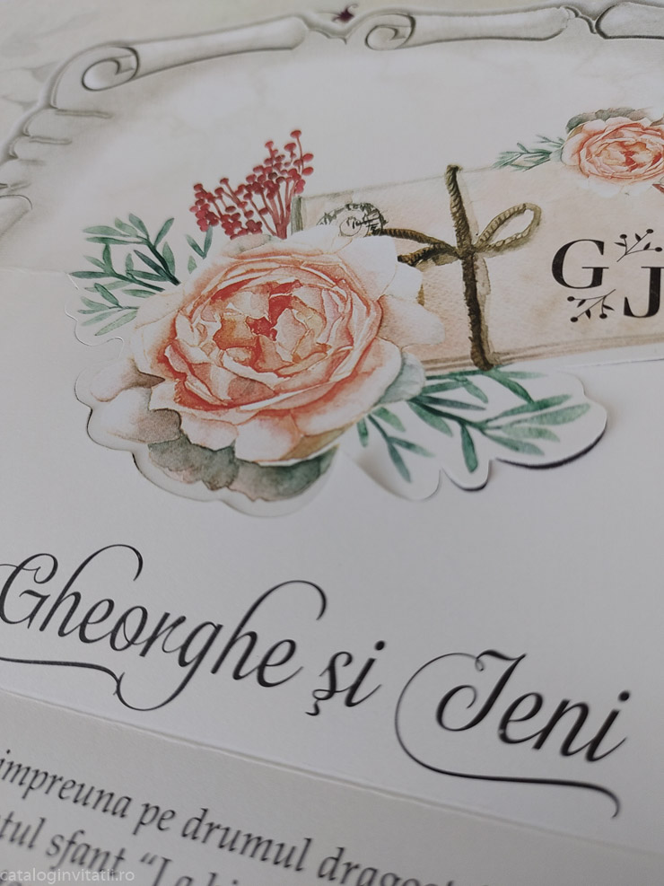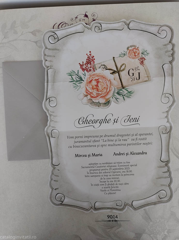 Invitatie tip papyrus decupaj trandafiri 9014 este un model realizat dintr-un carton 180g/mp care se impatureste in doua pe orizontala. Textul se tipareste in zona de sub trandafiri . Partea superioara are un trandafir decupat pe contur si acesta acopera o parte din text.