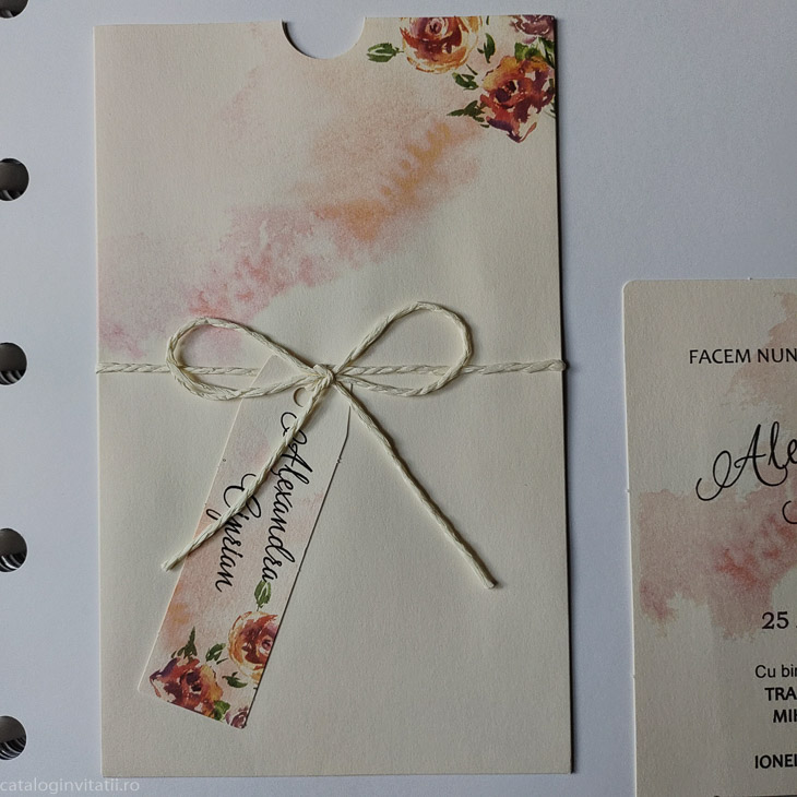 - cartonul text se introduce in mapa tip teaca si invitatia este accesorizata cu un snur cu eticheta pe care se trece prenumele mirilor.