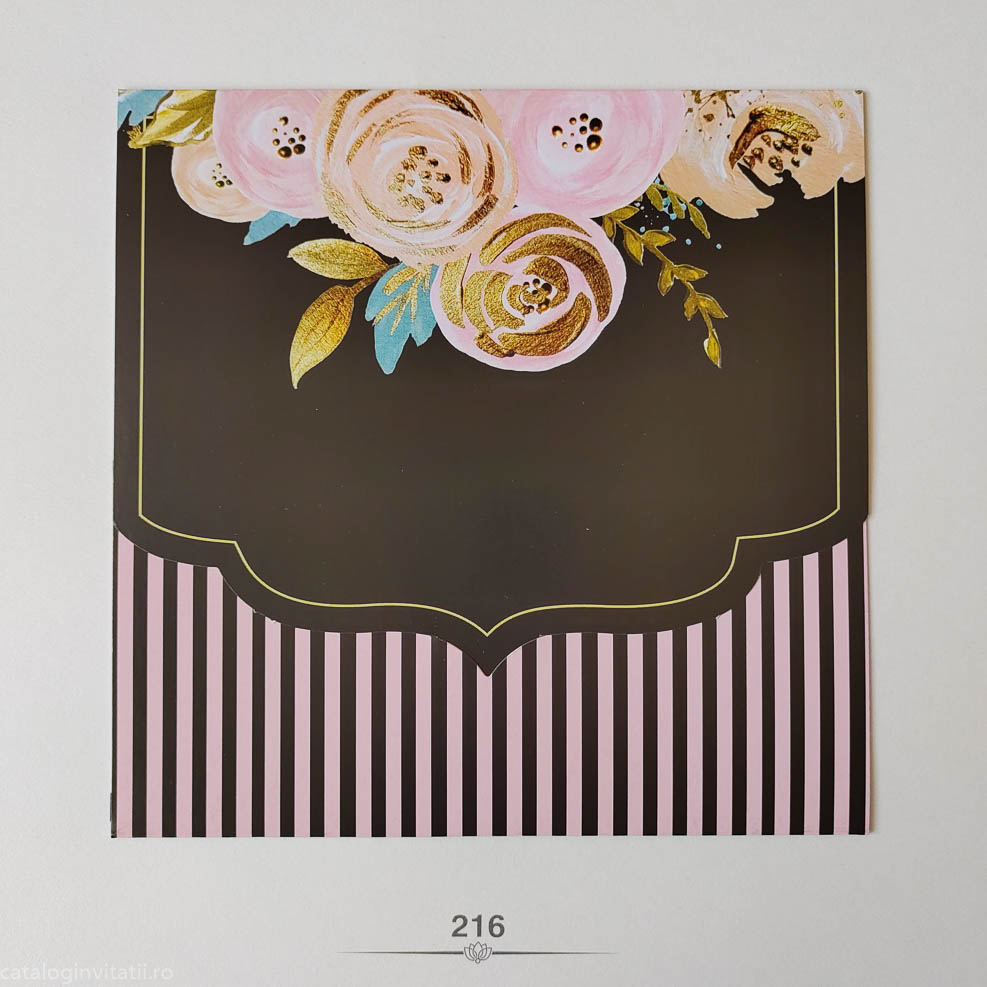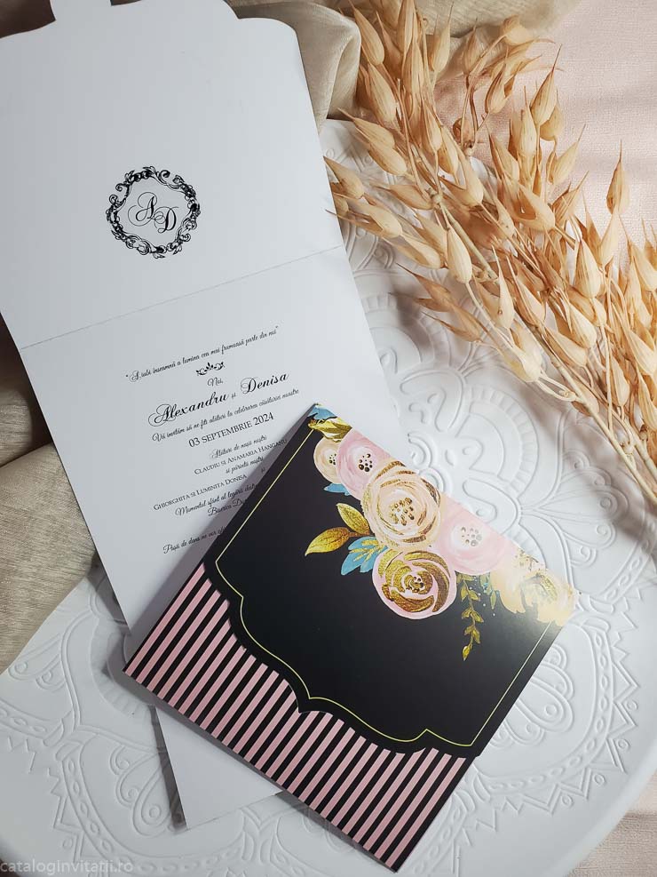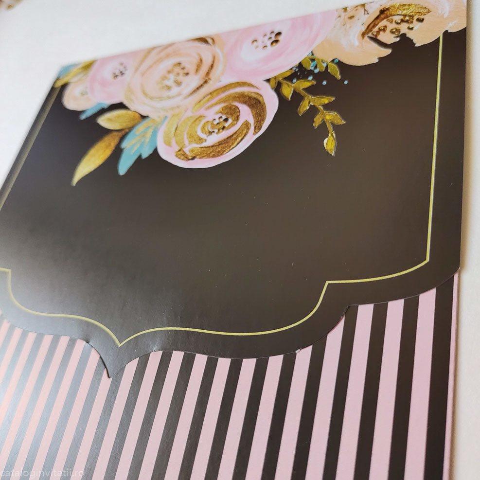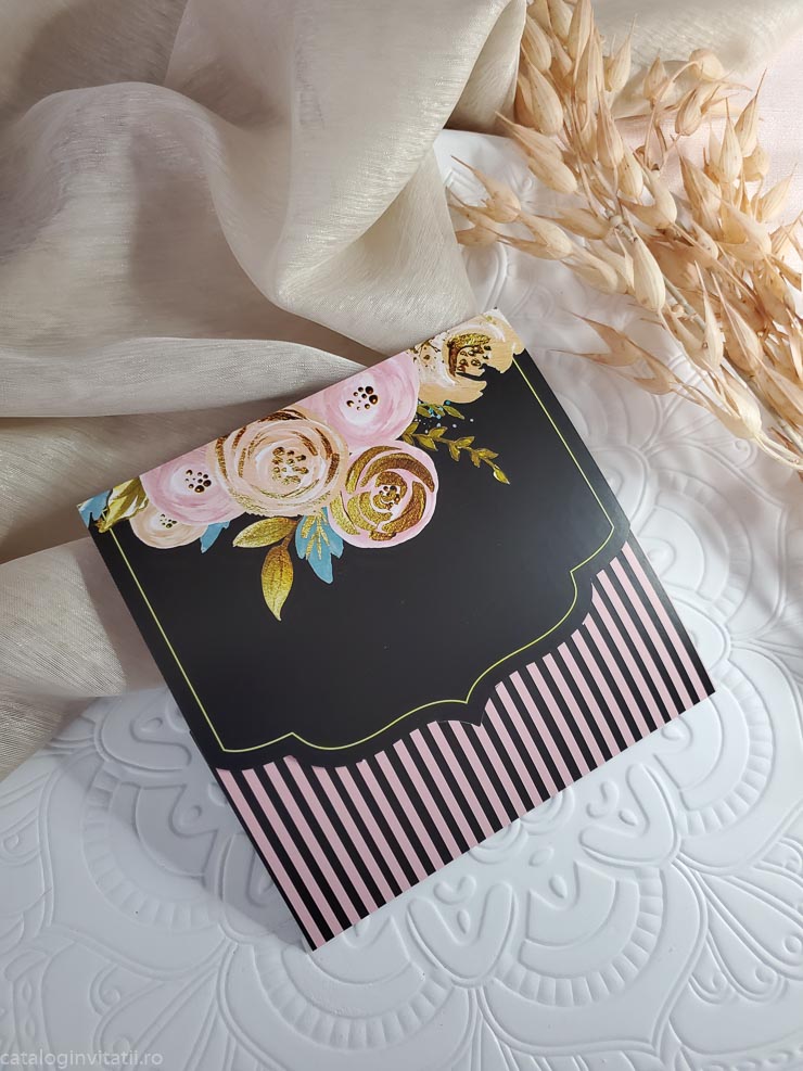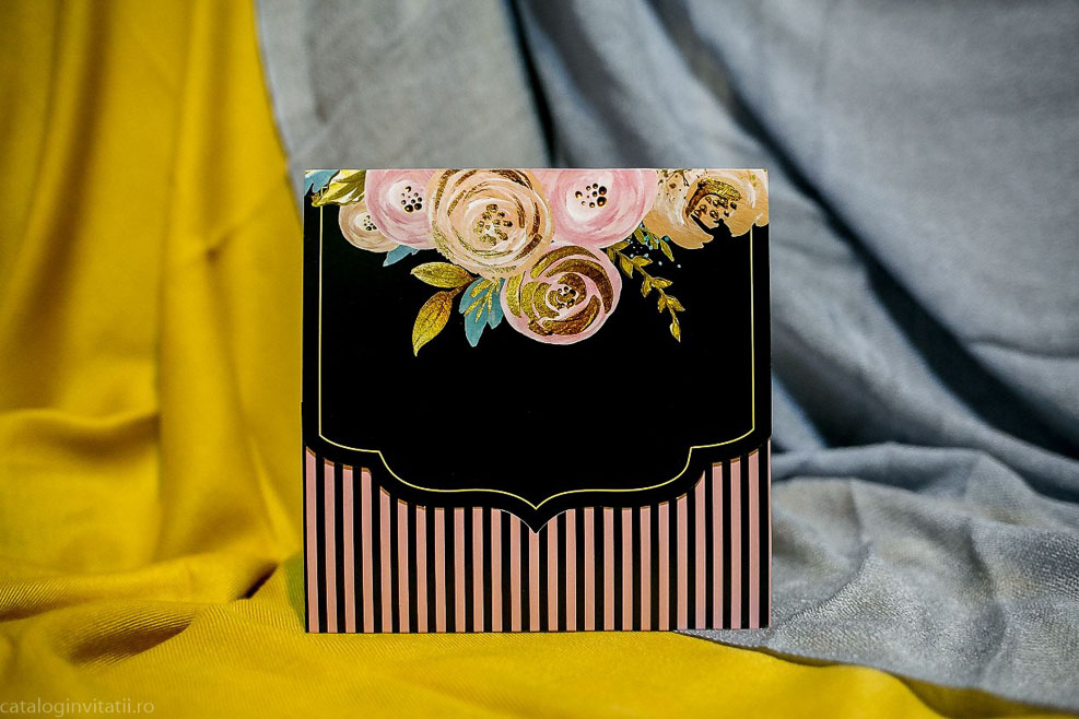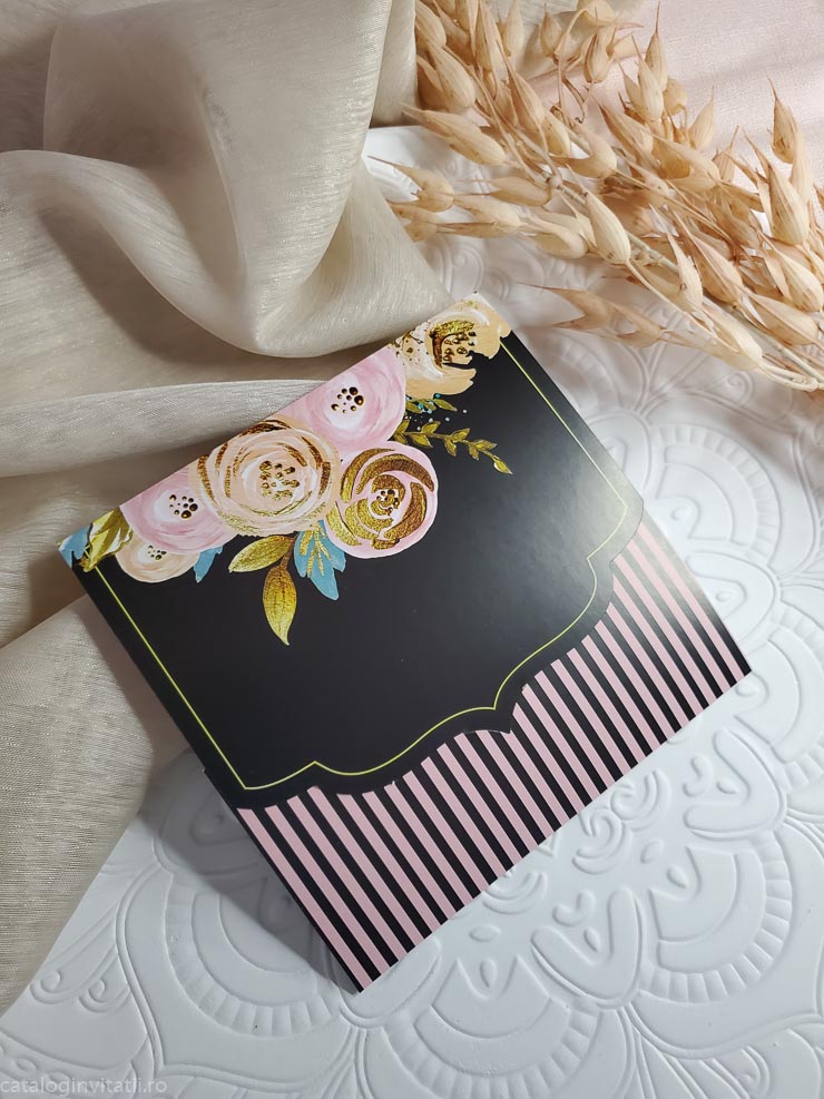 Invitatie trandafiri pe clapa neagra si fundal zebrat 216 pe partea superioară a invitației, se află o imagine de trandafiri, care adaugă o notă romantică și delicată, cu tonuri de roz, roșu și auriu. Fundalul negru adaugă un contrast elegant și încadrarea perfectă pentru trandafiri. Pe partea inferioară a invitației, un model zebrat adaugă o notă de joc și de distracție. Designul atractiv și îndrăzneț se va potrivi perfect cu o temă de nuntă modernă și neconvențională.