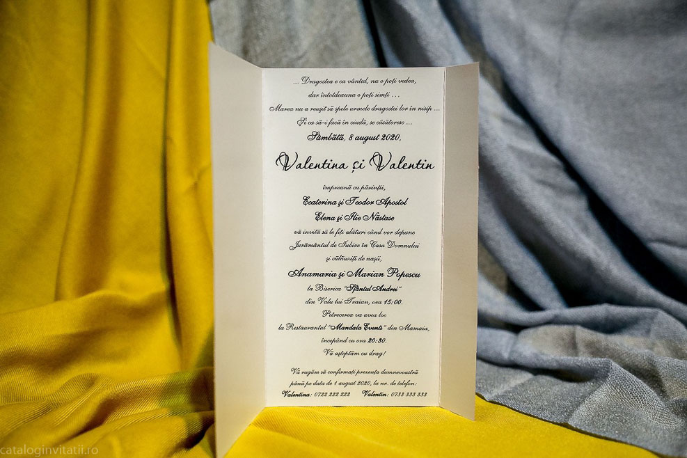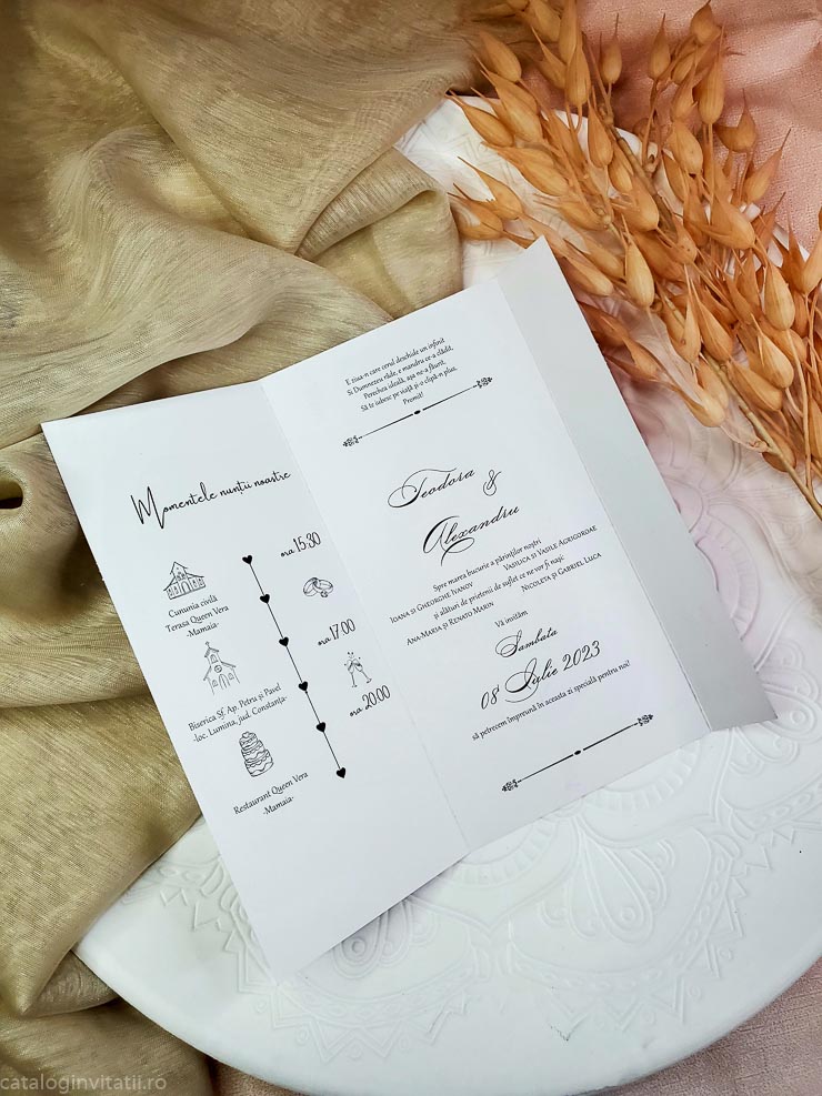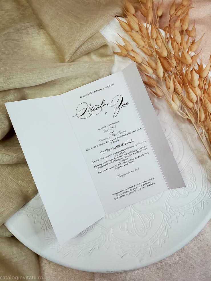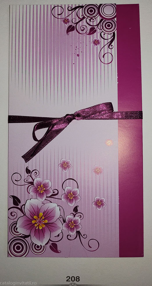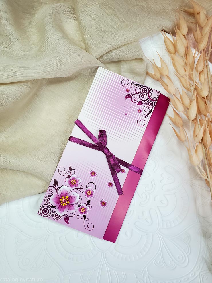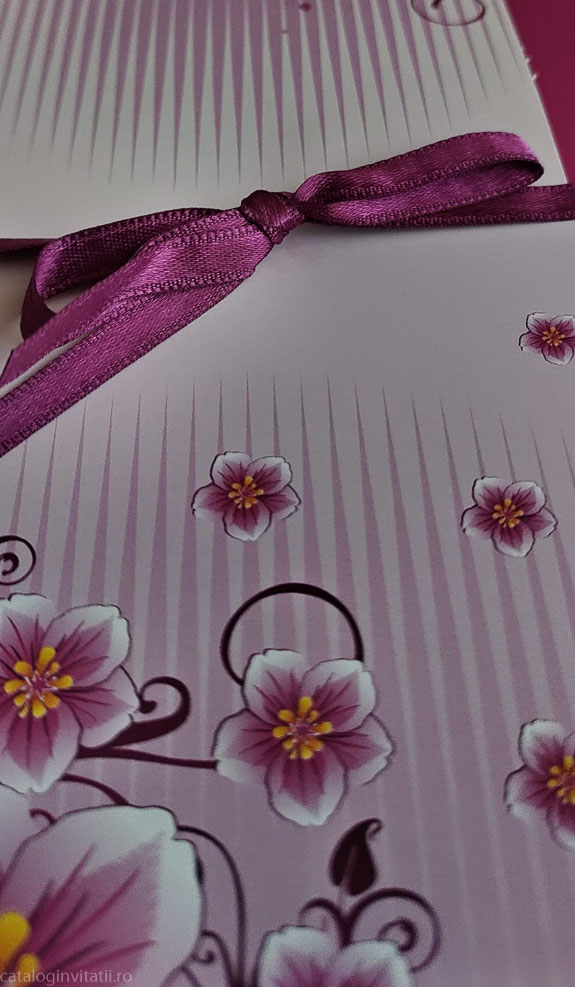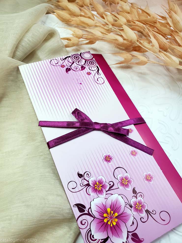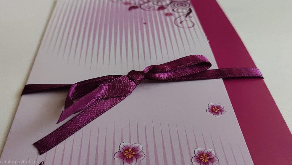 Aceasta invitatie de nunta este realizata din carton de 250g/mp, de culoare magenta la exterior cu un design floral delicat, si detalii elegante. Are o funda din saten care adauga un plus de stralucire si un interior imprimat cu un fundal alb, care adauga un plus de rafinament. Aceasta invitatie este perfecta pentru a surprinde si a transmite emotia unei nunti speciale.