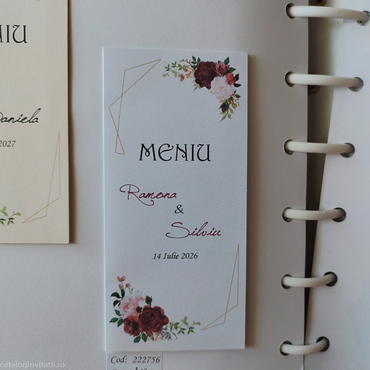 Meniu cu decor floral mixt 222756 este un model  realizat din carton alb mat ce se împăturește in doua pe verticala decorat la exterior cu model grafic floral mixr in coltul stanga jos dreapta sus,  data evenimentului este trecuta sub prenumele mirilor.  La interior meniul se poate scrie pe partea stanga si partea dreapta,  băuturi  stânga si meniu mâncare dreapta.