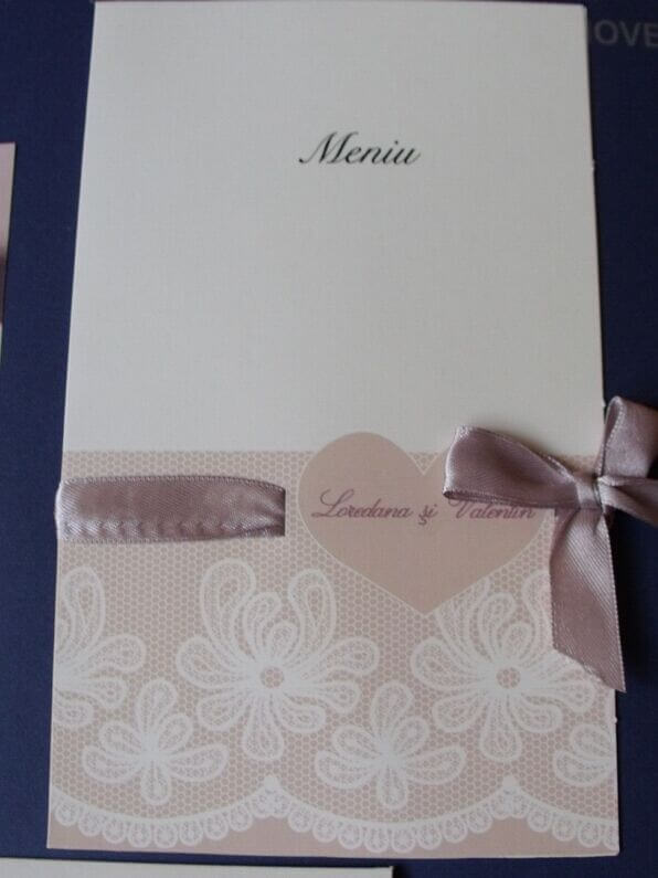 Se împăturește in doua pe verticla având la exterior tiparit cuvantul Meniu, iar mai jos prenumele mirilor pe sub care trece panglica din saten gri argintiu .