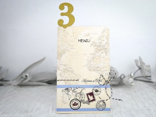 Meniu Voiaj 3223 este confecționat dintr-un carton maroniu deschis cu decor efecte postale