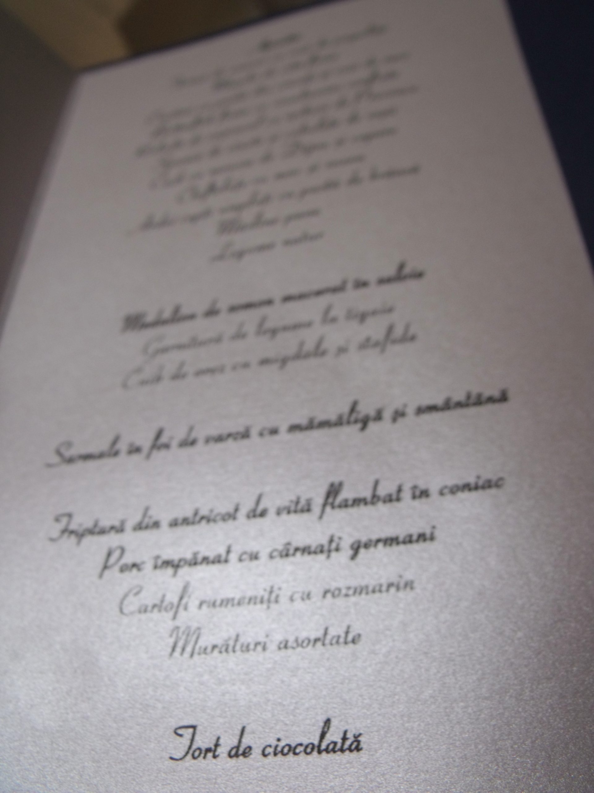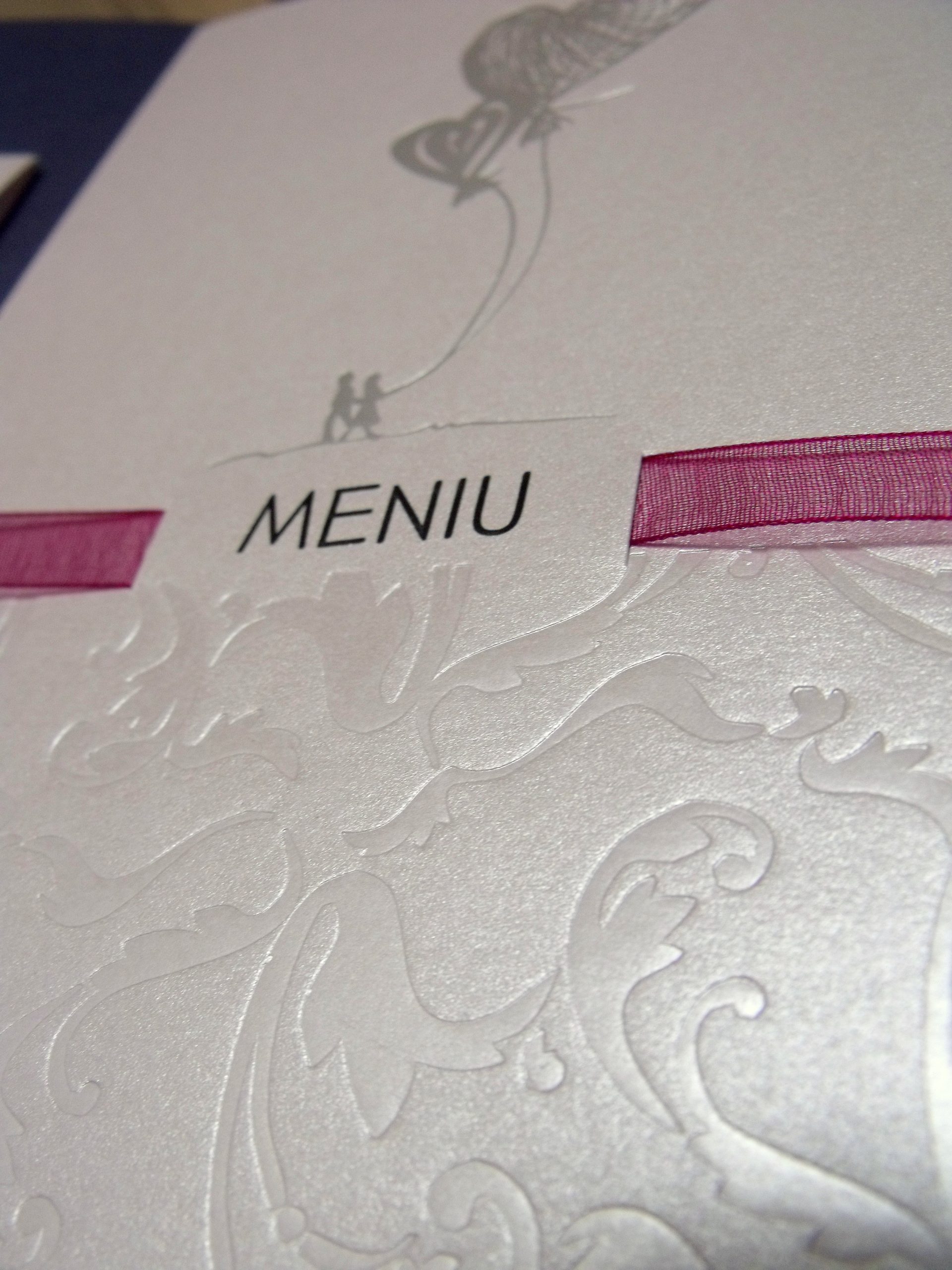 Menu nunta 3110 confecționat dintr-un carton argintiu sidefat ce se împăturește in doua pe verticala având la exterior elemente grafice florale stilizate in stil victorian cu textura metalica embosata. Si doua siluete care tin doua baloane sub forma de inima . Pe centru este incadrat cuvantul Menu pe sub care trece o panglica din organza de culoare mov.