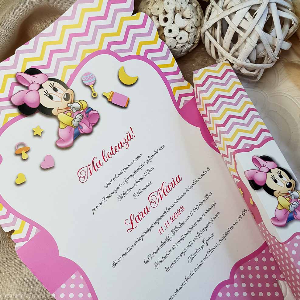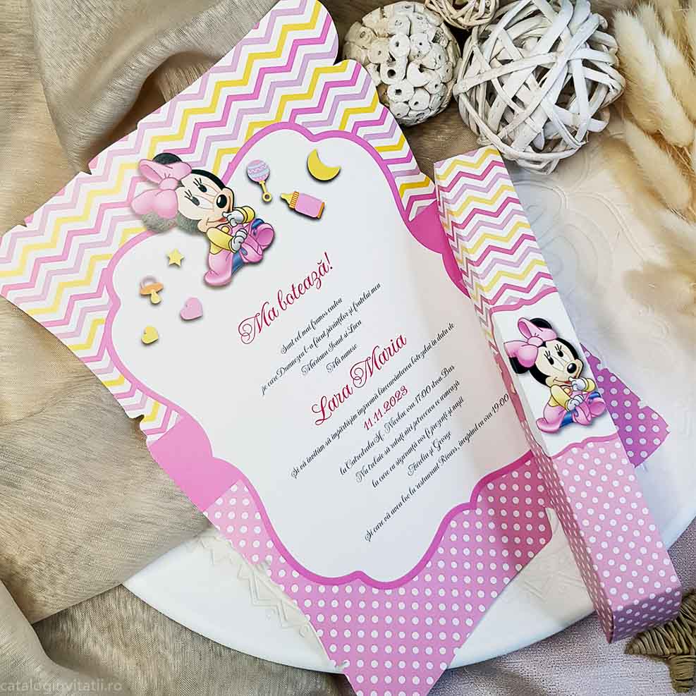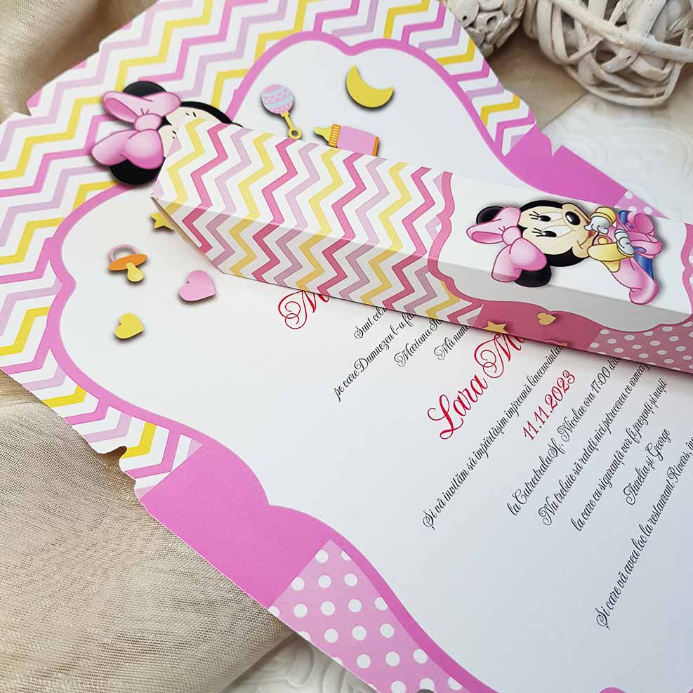 - un carton text tip papirus cu model grafic roz pentru fetite si personaj Disney Minnie Mouse