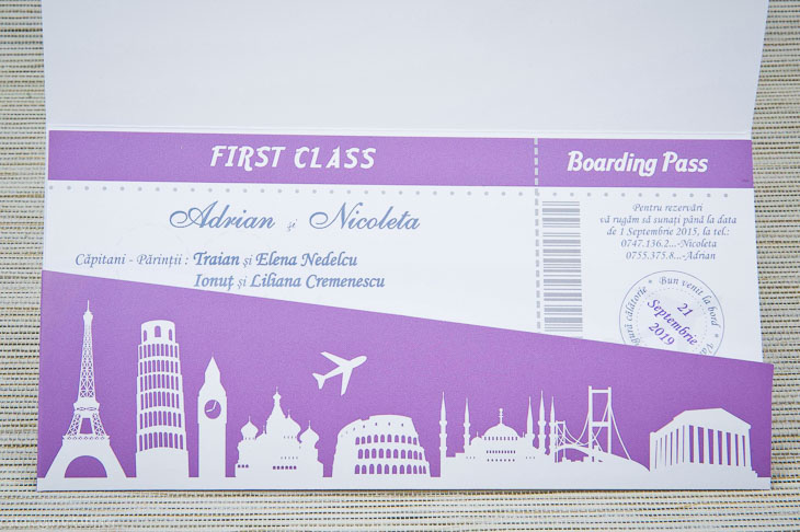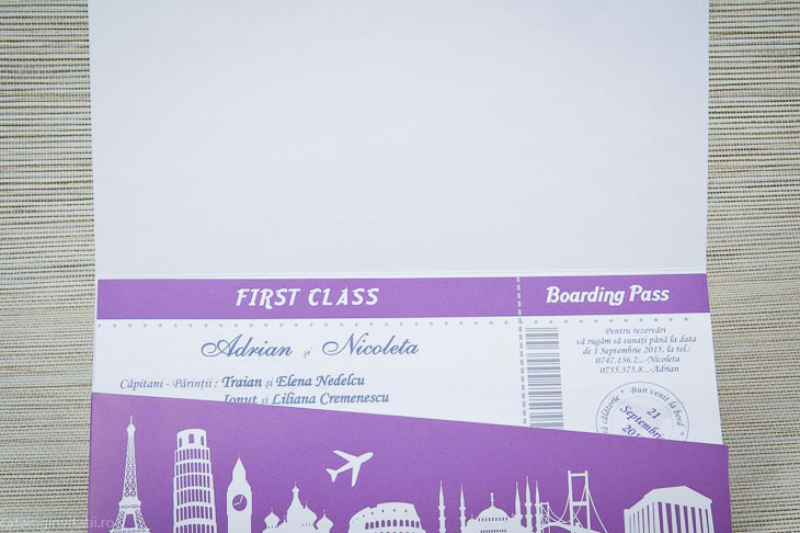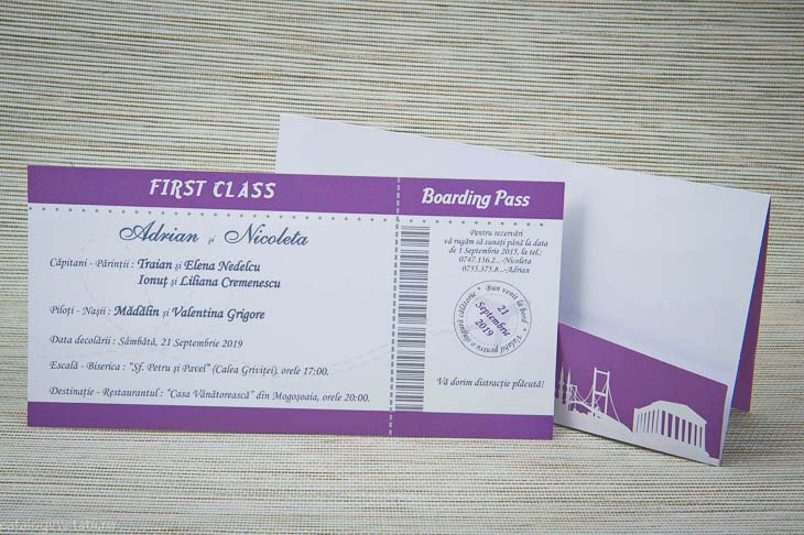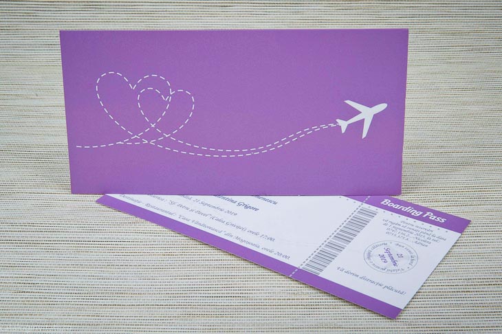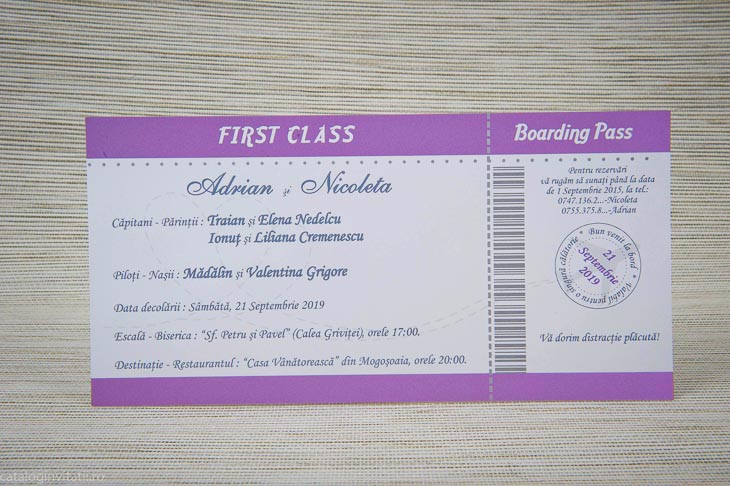 Invitație bitel avion este un model realizat dintr-un carton  cu forma unui bilet de avion Boarding Pass.